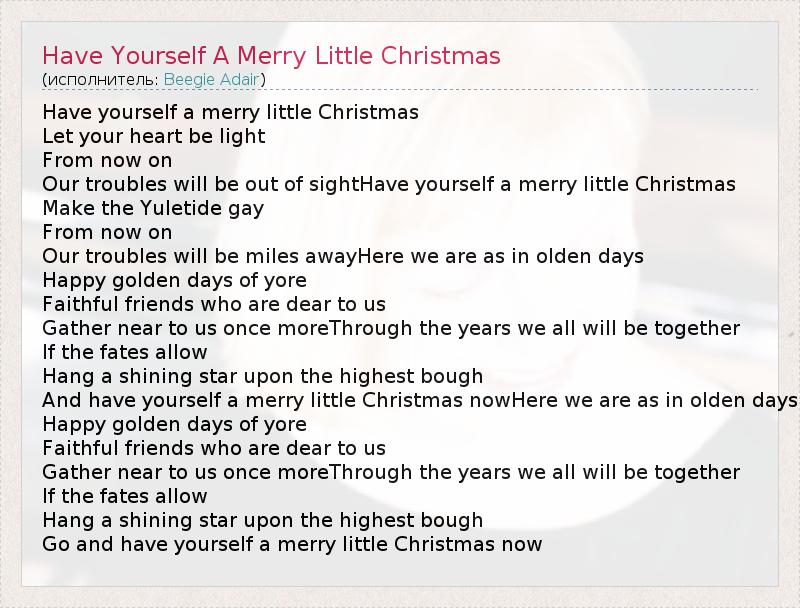 Have yourself a merry little Christmas Let your heart be light From now on Our troubles will be out of sightHave yourself a merry little Christmas Make the Yuletide gay From now on Our troubles will be miles awayHere we are as in olden days Happy golden days of yore Faithful friends who are dear to us Gather near to us once moreThrough the years we all will be together If the fates allow Hang a shining star upon the highest bough And have yourself a merry little Christmas nowHere we are as in olden days Happy golden days of yore Faithful friends who are dear to us Gather near to us once moreThrough the years we all will be together If the fates allow Hang a shining star upon the highest bough Go and have yourself a merry little Christmas now