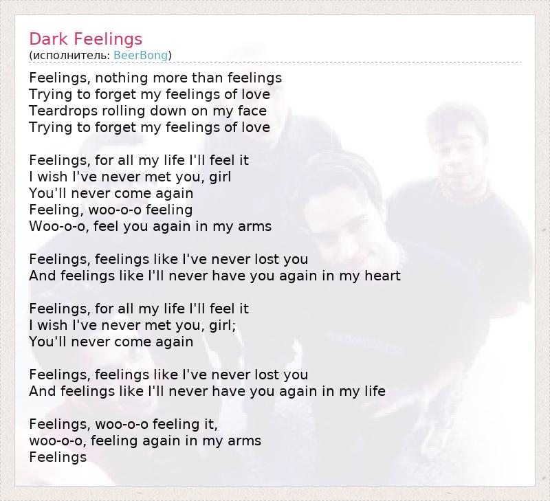 Feelings, nothing more than feelings Trying to forget my feelings of love Teardrops rolling down on my face Trying to forget my feelings of love Feelings, for all my life I'll feel it I wish I've never met you, girl You'll never come again Feeling, woo-o-o feeling Woo-o-o, feel you again in my arms Feelings, feelings like I've never lost you And feelings like I'll never have you again in my heart Feelings, for all my life I'll feel it I wish I've never met you, girl; You'll never come again Feelings, feelings like I've never lost you And feelings like I'll never have you again in my life Feelings, woo-o-o feeling it, woo-o-o, feeling again in my arms Feelings