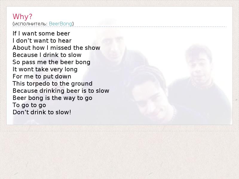 If I want some beer I don't want to hear About how I missed the show Because I drink to slow So pass me the beer bong It wont take very long For me to put down This torpedo to the ground Because drinking beer is to slow Beer bong is the way to go To go to go Don't drink to slow!