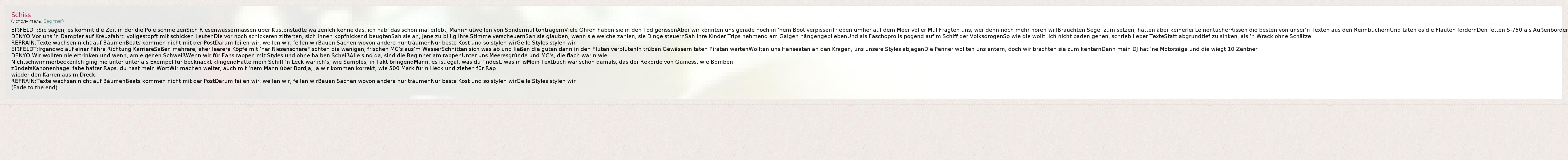 EIßFELDT:Sie sagen, es kommt die Zeit in der die Pole schmelzenSich Riesenwassermassen über Küstenstädte wälzenIch kenne das, ich hab' das schon mal erlebt, MannFlutwellen von SondermülltonträgernViele Ohren haben sie in den Tod gerissenAber wir konnten uns gerade noch in 'nem Boot verpissenTrieben umher auf dem Meer voller MüllFragten uns, wer denn noch mehr hören willBrauchten Segel zum setzen, hatten aber keinerlei LeinentücherRissen die besten von unser'n Texten aus den ReimbüchernUnd taten es die Flauten fordernDen fetten S-750 als Außenborder