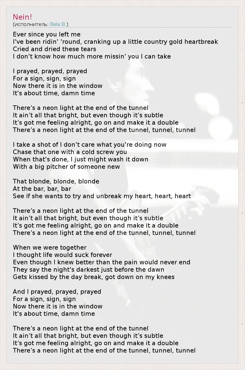 С тех пор, как ты бросила меня, Я наматывал круги, усиливая боль разбитого сердца, Я плакал и вытирал эти слёзы, Не знаю, сколько ещё тоски по тебе я смогу выдержать... Я молил, молил, молил Подать мне знак. И вот он в окне, Пришло время, чёртово время. В конце туннеля мерцает неоновый свет, Он не такой уж и яркий, и хотя он едва различим, Я чувствую себя замечательно, давай удвоим дозу. Неоновый свет мерцает в конце туннеля. Я делаю глоток "Мне плевать, чем ты сейчас занята", Запивая холодным "Иди куда подальше". После этого я смогу всё это запить Большой бадьёй "её, "другой"". Та блондинка, блондинка, блондинка У бара, Посмотрим, захочет ли она исцелить моё разбитое сердце... В конце туннеля мерцает неоновый свет, Он не такой уж и яркий, и хотя он едва различим, Я чувствую себя замечательно, давай удвоим дозу. Неоновый свет мерцает в конце туннеля. Когда мы были вместе, Я думал, что жизнь будет вечным отстоем. Хотя я отлично понимал, что боль никогда не прекратится, Говорят, ночь темнее всего перед самым рассветом, Который её целует... Я встал на колени, И молил, молил, молил Подать мне знак. И вот он в окне, Пришло время, чёртово время. В конце туннеля мерцает неоновый свет, Он не такой уж и яркий, и хотя он едва различим, Я чувствую себя замечательно, давай удвоим дозу. Неоновый свет мерцает в конце туннеля.