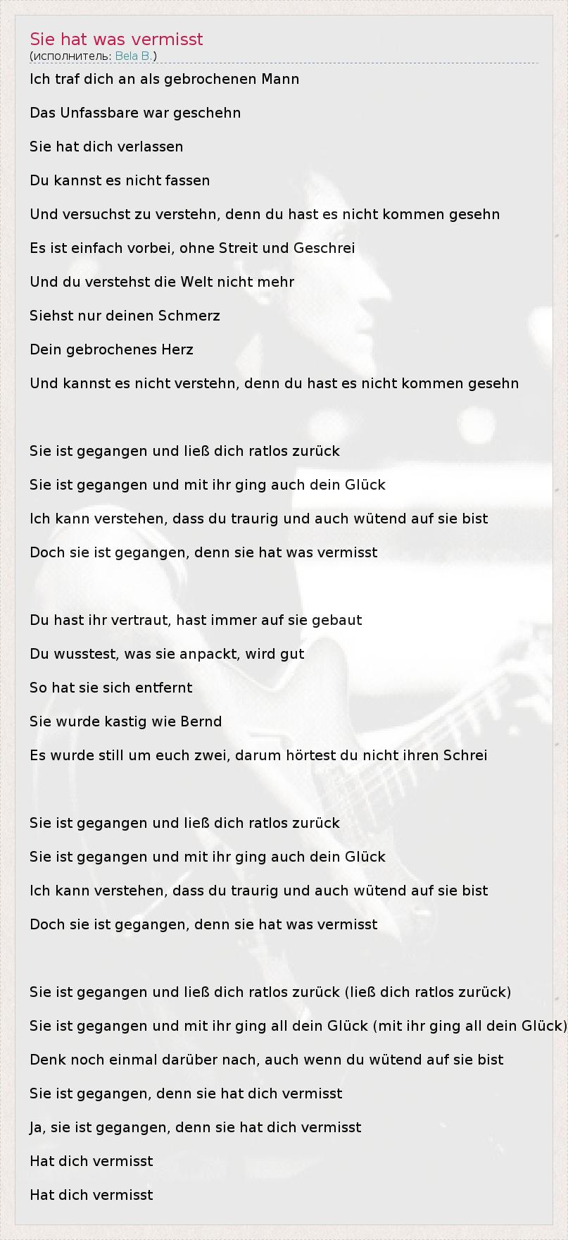 Ich traf dich an als gebrochenen Mann Das Unfassbare war geschehn Sie hat dich verlassen Du kannst es nicht fassen Und versuchst zu verstehn, denn du hast es nicht kommen gesehn Es ist einfach vorbei, ohne Streit und Geschrei Und du verstehst die Welt nicht mehr Siehst nur deinen Schmerz Dein gebrochenes Herz Und kannst es nicht verstehn, denn du hast es nicht kommen gesehn Sie ist gegangen und ließ dich ratlos zurück Sie ist gegangen und mit ihr ging auch dein Glück Ich kann verstehen, dass du traurig und auch wütend auf sie bist Doch sie ist gegangen, denn sie hat was vermisst Du hast ihr vertraut, hast immer auf sie gebaut Du wusstest, was sie anpackt, wird gut So hat sie sich entfernt Sie wurde kastig wie Bernd Es wurde still um euch zwei, darum hörtest du nicht ihren Schrei Sie ist gegangen und ließ dich ratlos zurück Sie ist gegangen und mit ihr ging auch dein Glück Ich kann verstehen, dass du traurig und auch wütend auf sie bist Doch sie ist gegangen, denn sie hat was vermisst Sie ist gegangen und ließ dich ratlos zurück (ließ dich ratlos zurück) Sie ist gegangen und mit ihr ging all dein Glück (mit ihr ging all dein Glück) Denk noch einmal darüber nach, auch wenn du wütend auf sie bist Sie ist gegangen, denn sie hat dich vermisst Ja, sie ist gegangen, denn sie hat dich vermisst Hat dich vermisst Hat dich vermisst