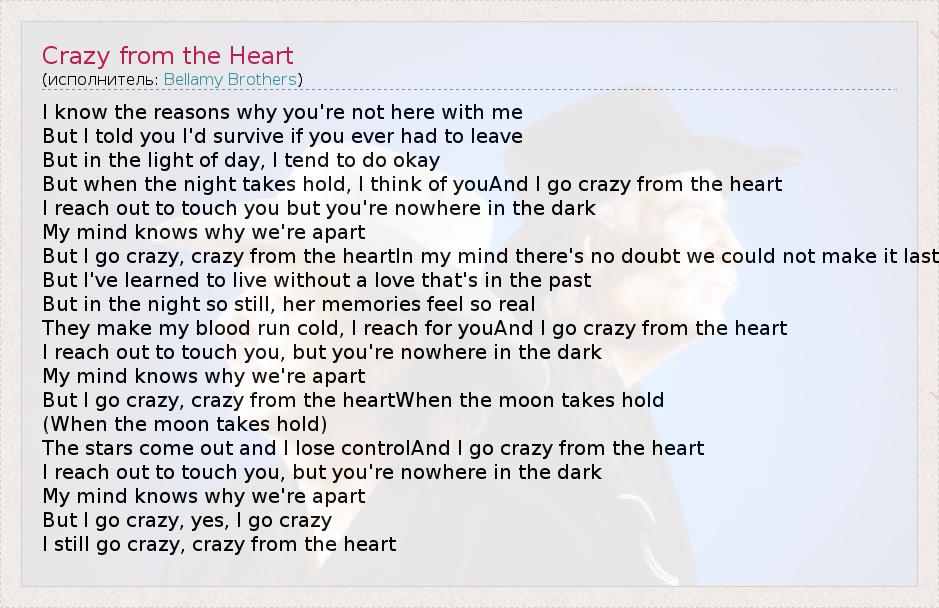 I know the reasons why you're not here with me But I told you I'd survive if you ever had to leave But in the light of day, I tend to do okay But when the night takes hold, I think of youAnd I go crazy from the heart I reach out to touch you but you're nowhere in the dark My mind knows why we're apart But I go crazy, crazy from the heartIn my mind there's no doubt we could not make it last But I've learned to live without a love that's in the past But in the night so still, her memories feel so real They make my blood run cold, I reach for youAnd I go crazy from the heart I reach out to touch you, but you're nowhere in the dark My mind knows why we're apart But I go crazy, crazy from the heartWhen the moon takes hold (When the moon takes hold) The stars come out and I lose controlAnd I go crazy from the heart I reach out to touch you, but you're nowhere in the dark My mind knows why we're apart But I go crazy, yes, I go crazy I still go crazy, crazy from the heart