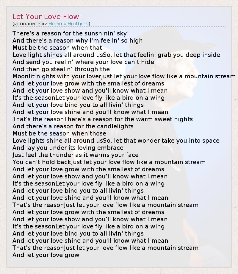 There's a reason for the sunshinin' sky And there's a reason why I'm feelin' so high Must be the season when that Love light shines all around usSo, let that feelin' grab you deep inside And send you reelin' where your love can't hide And then go stealin' through the Moonlit nights with your loverJust let your love flow like a mountain stream And let your love grow with the smallest of dreams And let your love show and you'll know what I mean It's the seasonLet your love fly like a bird on a wing And let your love bind you to all livin' things And let your love shine and you'll know what I mean That's the reasonThere's a reason for the warm sweet nights And there's a reason for the candlelights Must be the season when those Love lights shine all around usSo, let that wonder take you into space And lay you under its loving embrace Just feel the thunder as it warms your face You can't hold backJust let your love flow like a mountain stream And let your love grow with the smallest of dreams And let your love show and you'll know what I mean It's the seasonLet your love fly like a bird on a wing And let your love bind you to all livin' things And let your love shine and you'll know what I mean That's the reasonJust let your love flow like a mountain stream And let your love grow with the smallest of dreams And let your love show and you'll know what I mean It's the seasonLet your love fly like a bird on a wing And let your love bind you to all livin' things And let your love shine and you'll know what I mean That's the reasonJust let your love flow like a mountain stream And let your love grow