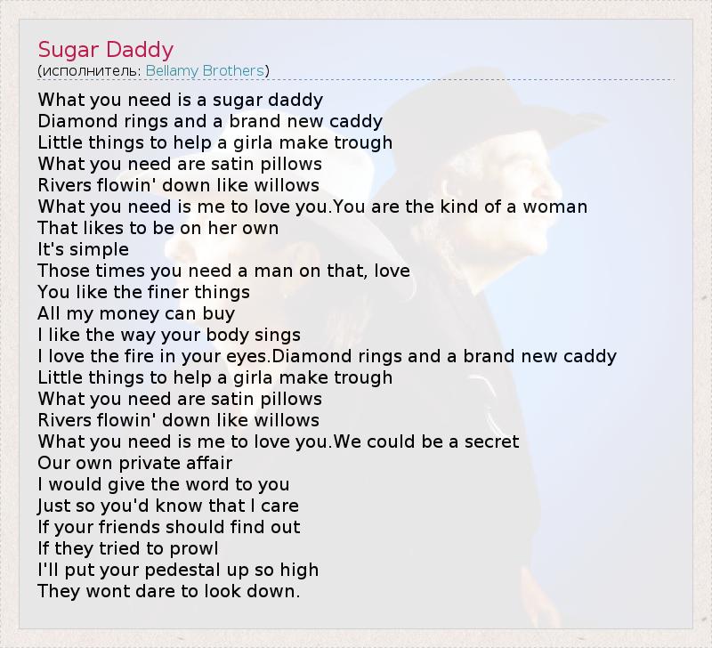 What you need is a sugar daddy Diamond rings and a brand new caddy Little things to help a girla make trough What you need are satin pillows Rivers flowin' down like willows What you need is me to love you.You are the kind of a woman That likes to be on her own It's simple Those times you need a man on that, love You like the finer things All my money can buy I like the way your body sings I love the fire in your eyes.Diamond rings and a brand new caddy Little things to help a girla make trough What you need are satin pillows Rivers flowin' down like willows What you need is me to love you.We could be a secret Our own private affair I would give the word to you Just so you'd know that I care If your friends should find out If they tried to prowl I'll put your pedestal up so high They wont dare to look down.