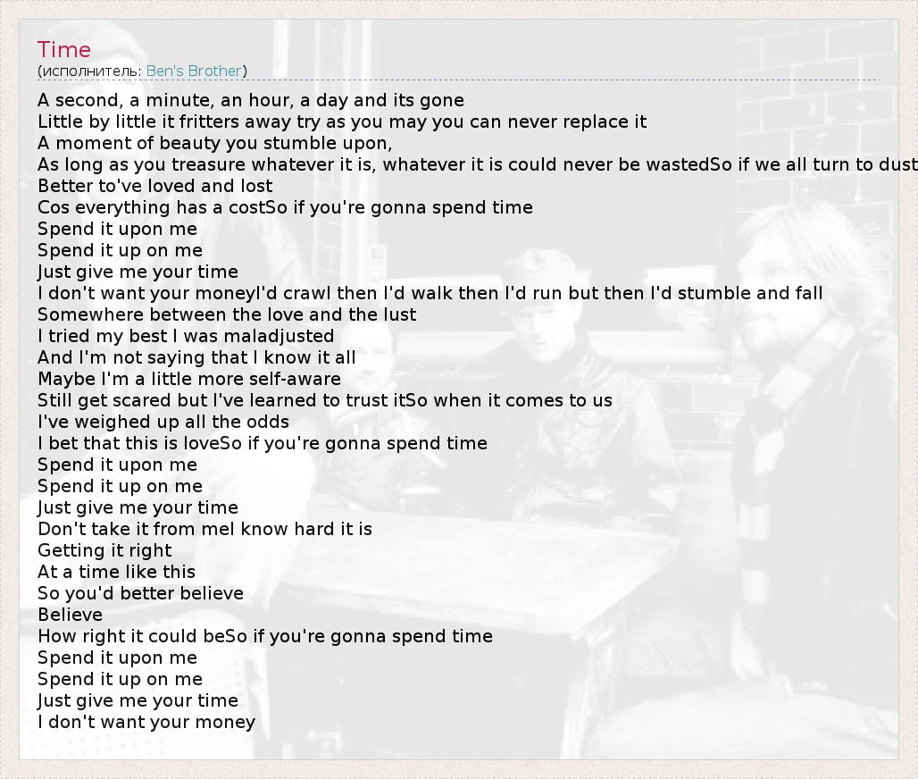 A second, a minute, an hour, a day and its gone Little by little it fritters away try as you may you can never replace it A moment of beauty you stumble upon, As long as you treasure whatever it is, whatever it is could never be wastedSo if we all turn to dust Better to've loved and lost Cos everything has a costSo if you're gonna spend time Spend it upon me Spend it up on me Just give me your time I don't want your moneyI'd crawl then I'd walk then I'd run but then I'd stumble and fall Somewhere between the love and the lust I tried my best I was maladjusted And I'm not saying that I know it all Maybe I'm a little more self-aware Still get scared but I've learned to trust itSo when it comes to us I've weighed up all the odds I bet that this is loveSo if you're gonna spend time Spend it upon me Spend it up on me Just give me your time Don't take it from meI know hard it is Getting it right At a time like this So you'd better believe Believe How right it could beSo if you're gonna spend time Spend it upon me Spend it up on me Just give me your time I don't want your money