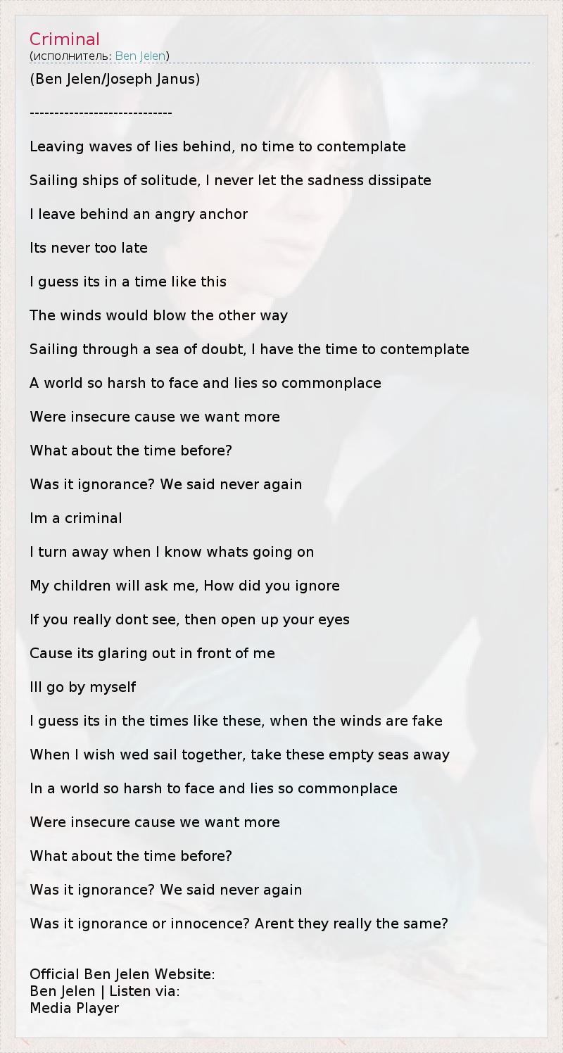 (Ben Jelen/Joseph Janus) ----------------------------- Leaving waves of lies behind, no time to contemplate Sailing ships of solitude, I never let the sadness dissipate I leave behind an angry anchor Its never too late I guess its in a time like this The winds would blow the other way Sailing through a sea of doubt, I have the time to contemplate A world so harsh to face and lies so commonplace Were insecure cause we want more What about the time before? Was it ignorance? We said never again Im a criminal I turn away when I know whats going on My children will ask me, How did you ignore If you really dont see, then open up your eyes Cause its glaring out in front of me Ill go by myself I guess its in the times like these, when the winds are fake When I wish wed sail together, take these empty seas away In a world so harsh to face and lies so commonplace Were insecure cause we want more What about the time before? Was it ignorance? We said never again Was it ignorance or innocence? Arent they really the same? Official Ben Jelen Website: Ben Jelen | Listen via: Media Player
