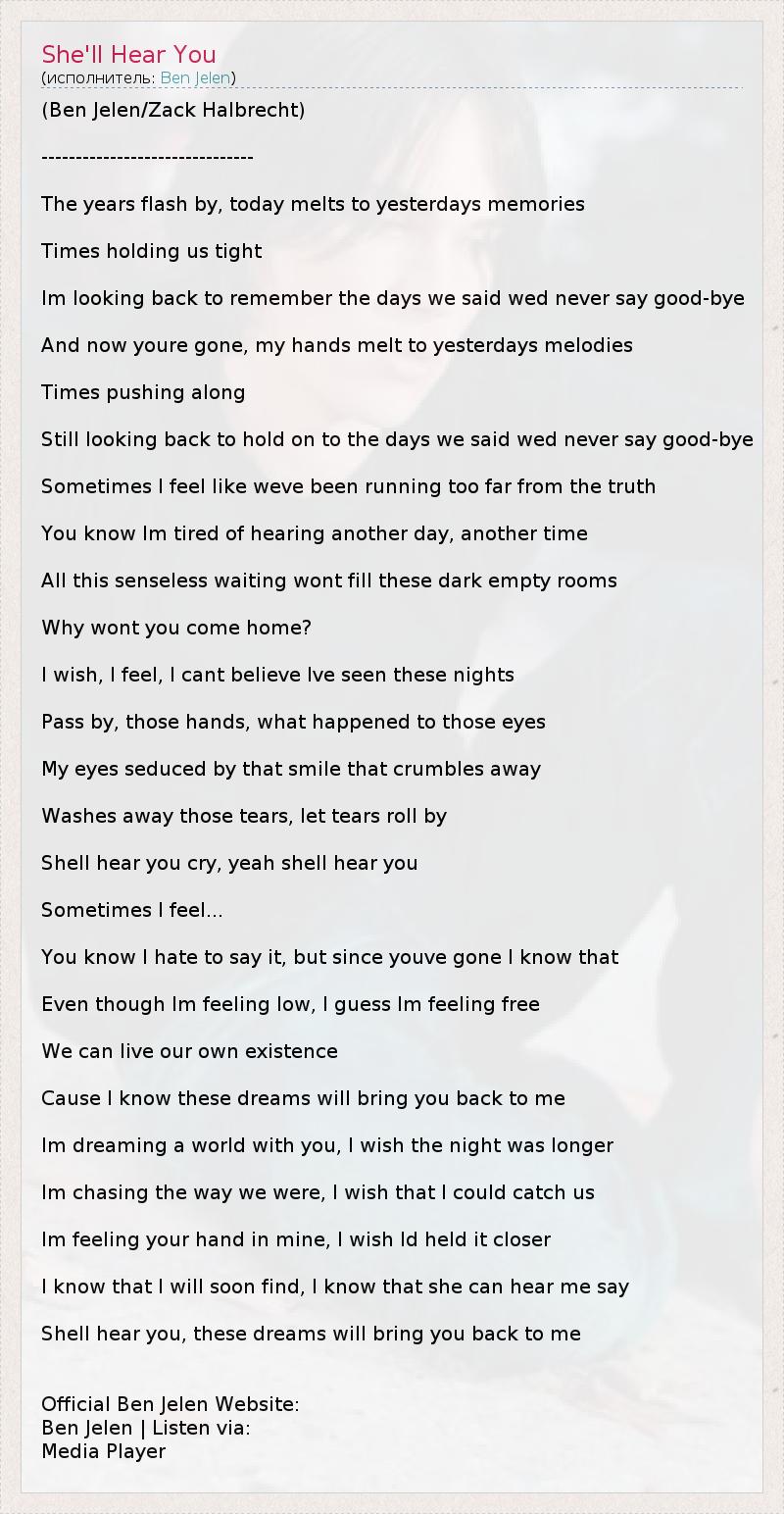 (Ben Jelen/Zack Halbrecht) ------------------------------- The years flash by, today melts to yesterdays memories Times holding us tight Im looking back to remember the days we said wed never say good-bye And now youre gone, my hands melt to yesterdays melodies Times pushing along Still looking back to hold on to the days we said wed never say good-bye Sometimes I feel like weve been running too far from the truth You know Im tired of hearing another day, another time All this senseless waiting wont fill these dark empty rooms Why wont you come home? I wish, I feel, I cant believe Ive seen these nights Pass by, those hands, what happened to those eyes My eyes seduced by that smile that crumbles away Washes away those tears, let tears roll by Shell hear you cry, yeah shell hear you Sometimes I feel... You know I hate to say it, but since youve gone I know that Even though Im feeling low, I guess Im feeling free We can live our own existence Cause I know these dreams will bring you back to me Im dreaming a world with you, I wish the night was longer Im chasing the way we were, I wish that I could catch us Im feeling your hand in mine, I wish Id held it closer I know that I will soon find, I know that she can hear me say Shell hear you, these dreams will bring you back to me Official Ben Jelen Website: Ben Jelen | Listen via: Media Player