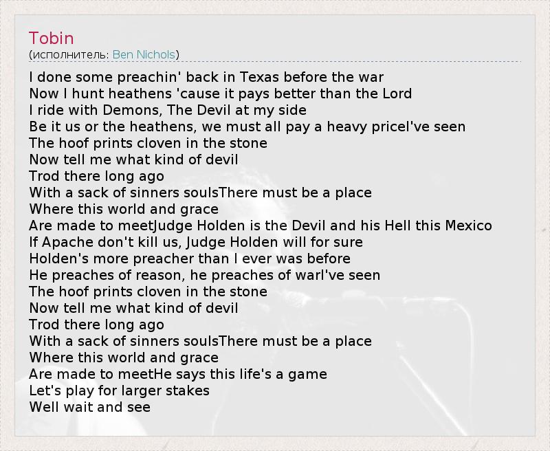 I done some preachin' back in Texas before the war Now I hunt heathens 'cause it pays better than the Lord I ride with Demons, The Devil at my side Be it us or the heathens, we must all pay a heavy priceI've seen The hoof prints cloven in the stone Now tell me what kind of devil Trod there long ago With a sack of sinners soulsThere must be a place Where this world and grace Are made to meetJudge Holden is the Devil and his Hell this Mexico If Apache don't kill us, Judge Holden will for sure Holden's more preacher than I ever was before He preaches of reason, he preaches of warI've seen The hoof prints cloven in the stone Now tell me what kind of devil Trod there long ago With a sack of sinners soulsThere must be a place Where this world and grace Are made to meetHe says this life's a game Let's play for larger stakes Well wait and see