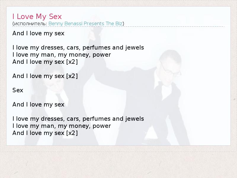 And I love my sex I love my dresses, cars, perfumes and jewels I love my man, my money, power And I love my sex [x2] And I love my sex [x2] Sex And I love my sex I love my dresses, cars, perfumes and jewels I love my man, my money, power And I love my sex [x2]