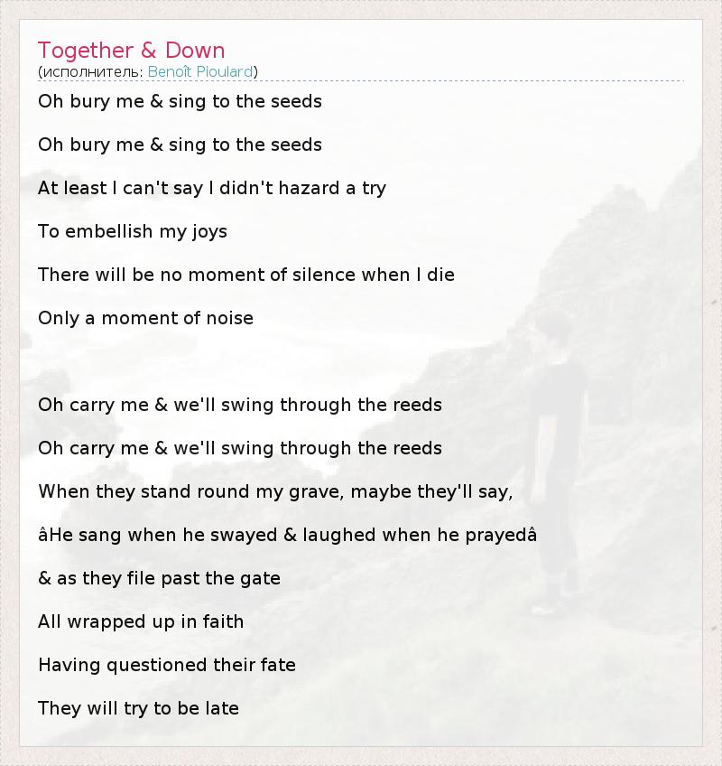 Oh bury me & sing to the seeds Oh bury me & sing to the seeds At least I can't say I didn't hazard a try To embellish my joys There will be no moment of silence when I die Only a moment of noise Oh carry me & we'll swing through the reeds Oh carry me & we'll swing through the reeds When they stand round my grave, maybe they'll say, âHe sang when he swayed & laughed when he prayedâ & as they file past the gate All wrapped up in faith Having questioned their fate They will try to be late