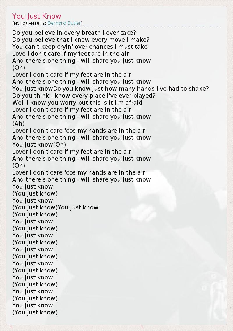 Do you believe in every breath I ever take? Do you believe that I know every move I make? You can't keep cryin' over chances I must take Love I don't care if my feet are in the air And there's one thing I will share you just know (Oh) Lover I don't care if my feet are in the air And there's one thing I will share you just know You just knowDo you know just how many hands I've had to shake? Do you think I know every place I've ever played? Well I know you worry but this is it I'm afraid Lover I don't care if my feet are in the air And there's one thing I will share you just know (Ah) Lover I don't care 'cos my hands are in the air And there's one thing I will share you just know You just know(Oh) Lover I don't care if my feet are in the air And there's one thing I will share you just know (Oh) Lover I don't care 'cos my hands are in the air And there's one thing I will share you just know You just know (You just know) You just know (You just know)You just know (You just know) You just know (You just know) You just know (You just know) You just know (You just know) You just know (You just know) You just know (You just know) You just know (You just know) You just know (You just know)