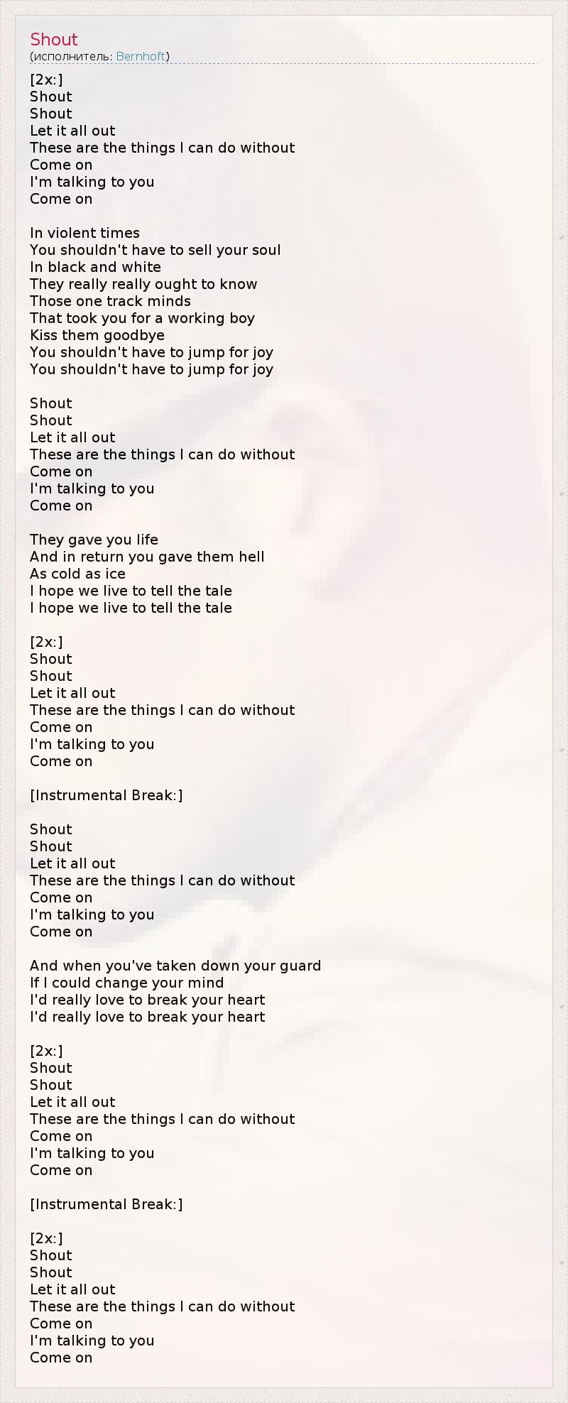 [2x:] Shout Shout Let it all out These are the things I can do without Come on I'm talking to you Come on In violent times You shouldn't have to sell your soul In black and white They really really ought to know Those one track minds That took you for a working boy Kiss them goodbye You shouldn't have to jump for joy You shouldn't have to jump for joy Shout Shout Let it all out These are the things I can do without Come on I'm talking to you Come on They gave you life And in return you gave them hell As cold as ice I hope we live to tell the tale I hope we live to tell the tale [2x:] Shout Shout Let it all out These are the things I can do without Come on I'm talking to you Come on [Instrumental Break:] Shout Shout Let it all out These are the things I can do without Come on I'm talking to you Come on And when you've taken down your guard If I could change your mind I'd really love to break your heart I'd really love to break your heart [2x:] Shout Shout Let it all out These are the things I can do without Come on I'm talking to you Come on [Instrumental Break:] [2x:] Shout Shout Let it all out These are the things I can do without Come on I'm talking to you Come on