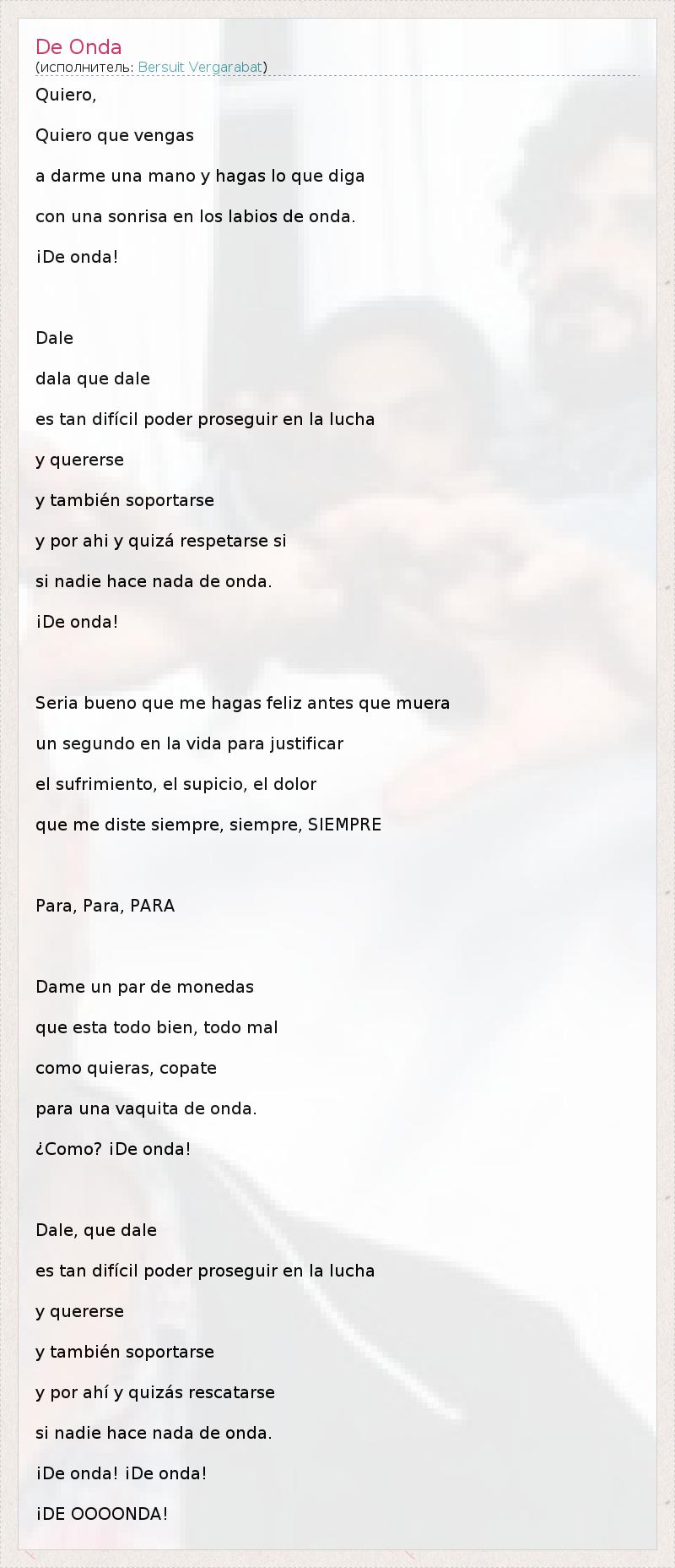 Quiero, Quiero que vengas a darme una mano y hagas lo que diga con una sonrisa en los labios de onda. ¡De onda! Dale dala que dale es tan difícil poder proseguir en la lucha y quererse y también soportarse y por ahi y quizá respetarse si si nadie hace nada de onda. ¡De onda! Seria bueno que me hagas feliz antes que muera un segundo en la vida para justificar el sufrimiento, el supicio, el dolor que me diste siempre, siempre, SIEMPRE Para, Para, PARA Dame un par de monedas que esta todo bien, todo mal como quieras, copate para una vaquita de onda. ¿Como? ¡De onda! Dale, que dale es tan difícil poder proseguir en la lucha y quererse y también soportarse y por ahí y quizás rescatarse si nadie hace nada de onda. ¡De onda! ¡De onda! ¡DE OOOONDA!