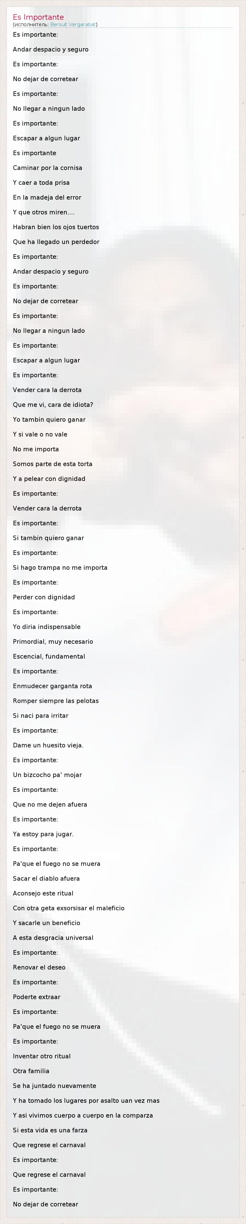Это интересно:Bersuit Vergarabat, сформировались в 1989 в Аргентине и являются одними из наиболее известных исполнителей латинского рока 90-х.После 2 х андеграундовых альбомов, группа стала смешивать рок с латиноамериканскими ритмами такими как кумбиа(колумбийский народный танец), чакарера(испанский танец), кандомбе(негритянский танец под барабаны) и куртетанзо(тоже латинский... продолжение