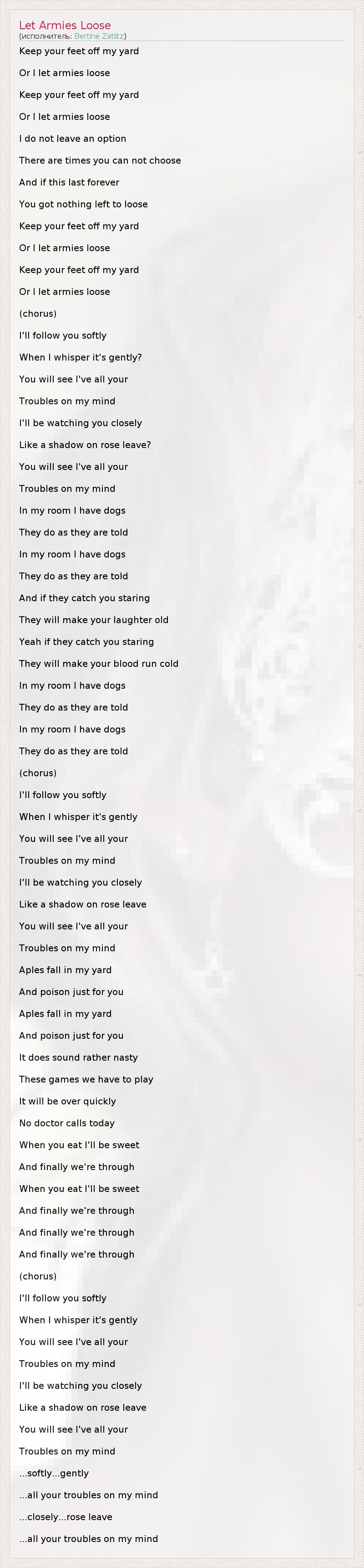Keep your feet off my yard Or I let armies loose Keep your feet off my yard Or I let armies loose I do not leave an option There are times you can not choose And if this last forever You got nothing left to loose Keep your feet off my yard Or I let armies loose Keep your feet off my yard Or I let armies loose (chorus) I'll follow you softly When I whisper it's gently? You will see I've all your Troubles on my mind I'll be watching you closely Like a shadow on rose leave? You will see I've all your Troubles on my mind In my room I have dogs They do as they are told In my room I have dogs They do as they are told And if they catch you staring They will make your laughter old Yeah if they catch you staring They will make your blood run cold In my room I have dogs They do as they are told In my room I have dogs They do as they are told (chorus) I'll follow you softly When I whisper it's gently You will see I've all your Troubles on my mind I'll be watching you closely Like a shadow on rose leave You will see I've all your Troubles on my mind Aples fall in my yard And poison just for you Aples fall in my yard And poison just for you It does sound rather nasty These games we have to play It will be over quickly No doctor calls today When you eat I'll be sweet And finally we're through When you eat I'll be sweet And finally we're through And finally we're through And finally we're through (chorus) I'll follow you softly When I whisper it's gently You will see I've all your Troubles on my mind I'll be watching you closely Like a shadow on rose leave You will see I've all your Troubles on my mind ...softly...gently ...all your troubles on my mind ...closely...rose leave ...all your troubles on my mind