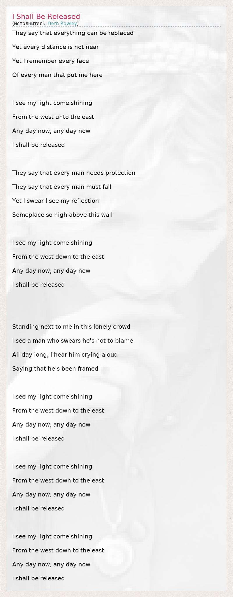 They say that everything can be replaced Yet every distance is not near Yet I remember every face Of every man that put me here I see my light come shining From the west unto the east Any day now, any day now I shall be released They say that every man needs protection They say that every man must fall Yet I swear I see my reflection Someplace so high above this wall I see my light come shining From the west down to the east Any day now, any day now I shall be released Standing next to me in this lonely crowd I see a man who swears he's not to blame All day long, I hear him crying aloud Saying that he's been framed I see my light come shining From the west down to the east Any day now, any day now I shall be released I see my light come shining From the west down to the east Any day now, any day now I shall be released I see my light come shining From the west down to the east Any day now, any day now I shall be released