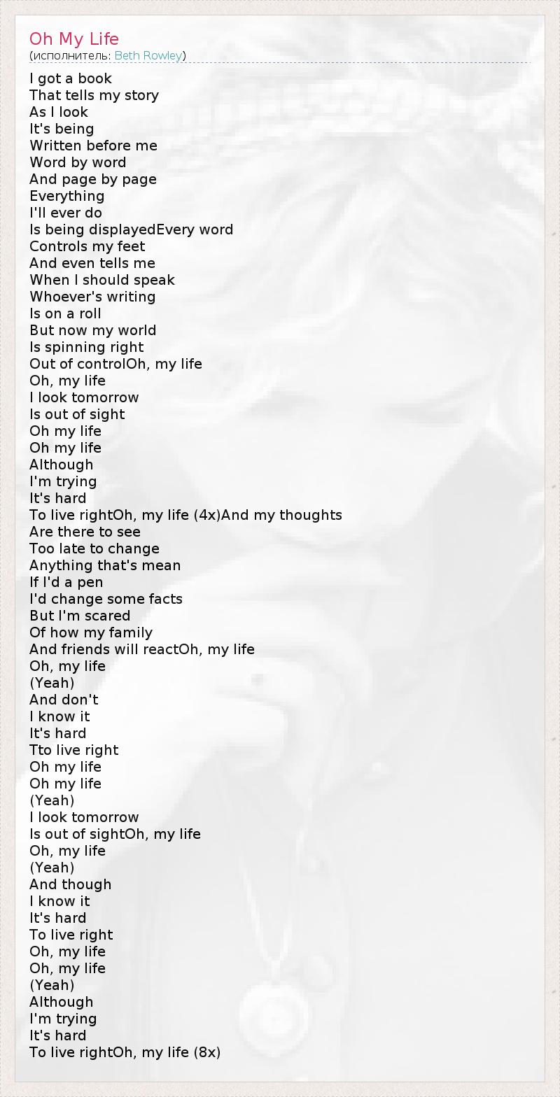 I got a book That tells my story As I look It's being Written before me Word by word And page by page Everything I'll ever do Is being displayedEvery word Controls my feet And even tells me When I should speak Whoever's writing Is on a roll But now my world Is spinning right Out of controlOh, my life Oh, my life I look tomorrow Is out of sight Oh my life Oh my life Although I'm trying It's hard To live rightOh, my life (4x)And my thoughts Are there to see Too late to change Anything that's mean If I'd a pen I'd change some facts But I'm scared Of how my family And friends will reactOh, my life Oh, my life (Yeah) And don't I know it It's hard Tto live right Oh my life Oh my life (Yeah) I look tomorrow Is out of sightOh, my life Oh, my life (Yeah) And though I know it It's hard To live right Oh, my life Oh, my life (Yeah) Although I'm trying It's hard To live rightOh, my life (8x)