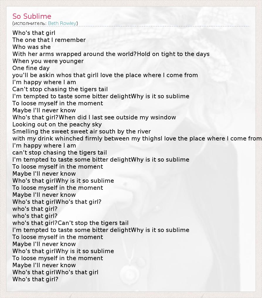 Who's that girl The one that I remember Who was she With her arms wrapped around the world?Hold on tight to the days When you were younger One fine day you'll be askin whos that girlI love the place where I come from I'm happy where I am Can't stop chasing the tigers tail I'm tempted to taste some bitter delightWhy is it so sublime To loose myself in the moment Maybe I'll never know Who's that girl?When did I last see outside my wsindow Looking out on the peachy sky Smelling the sweet sweet air south by the river with my drink whinched firmly between my thighsI love the place where I come from I'm happy where I am can't stop chasing the tigers tail I'm tempted to taste some bitter delightWhy is it so sublime To loose myself in the moment Maybe I'll never know Who's that girlWhy is it so sublime To loose myself in the moment Maybe I'll never know Who's that girlWho's that girl? who's that girl? who's that girl? who's that girl?Can't stop the tigers tail I'm tempted to taste some bitter delightWhy is it so sublime To loose myself in the moment Maybe I'll never know Who's that girlWhy is it so sublime To loose myself in the moment Maybe I'll never know Who's that girlWho's that girl Who's that girl?