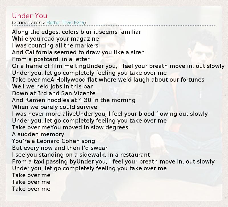 Along the edges, colors blur it seems familiar While you read your magazine I was counting all the markers And California seemed to draw you like a siren From a postcard, in a letter Or a frame of film meltingUnder you, I feel your breath move in, out slowly Under you, let go completely feeling you take over me Take over meA Hollywood flat where we'd laugh about our fortunes Well we held jobs in this bar Down at 3rd and San Vicente And Ramen noodles at 4:30 in the morning When we barely could survive I was never more aliveUnder you, I feel your blood flowing out slowly Under you, let go completely feeling you take over me Take over meYou moved in slow degrees A sudden memory You're a Leonard Cohen song But every now and then I'd swear I see you standing on a sidewalk, in a restaurant From a taxi passing byUnder you, I feel your breath move in, out slowly Under you, let go completely feeling you take over me Take over me Take over me Take over me