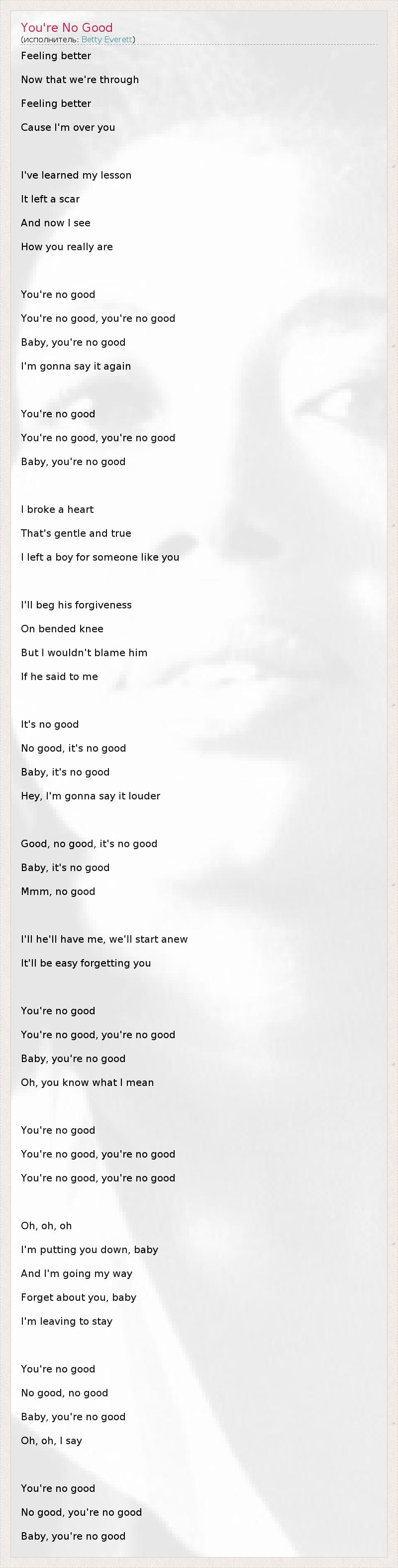 Feeling better Now that we're through Feeling better Cause I'm over you I've learned my lesson It left a scar And now I see How you really are You're no good You're no good, you're no good Baby, you're no good I'm gonna say it again You're no good You're no good, you're no good Baby, you're no good I broke a heart That's gentle and true I left a boy for someone like you I'll beg his forgiveness On bended knee But I wouldn't blame him If he said to me It's no good No good, it's no good Baby, it's no good Hey, I'm gonna say it louder Good, no good, it's no good Baby, it's no good Mmm, no good I'll he'll have me, we'll start anew It'll be easy forgetting you You're no good You're no good, you're no good Baby, you're no good Oh, you know what I mean You're no good You're no good, you're no good You're no good, you're no good Oh, oh, oh I'm putting you down, baby And I'm going my way Forget about you, baby I'm leaving to stay You're no good No good, no good Baby, you're no good Oh, oh, I say You're no good No good, you're no good Baby, you're no good