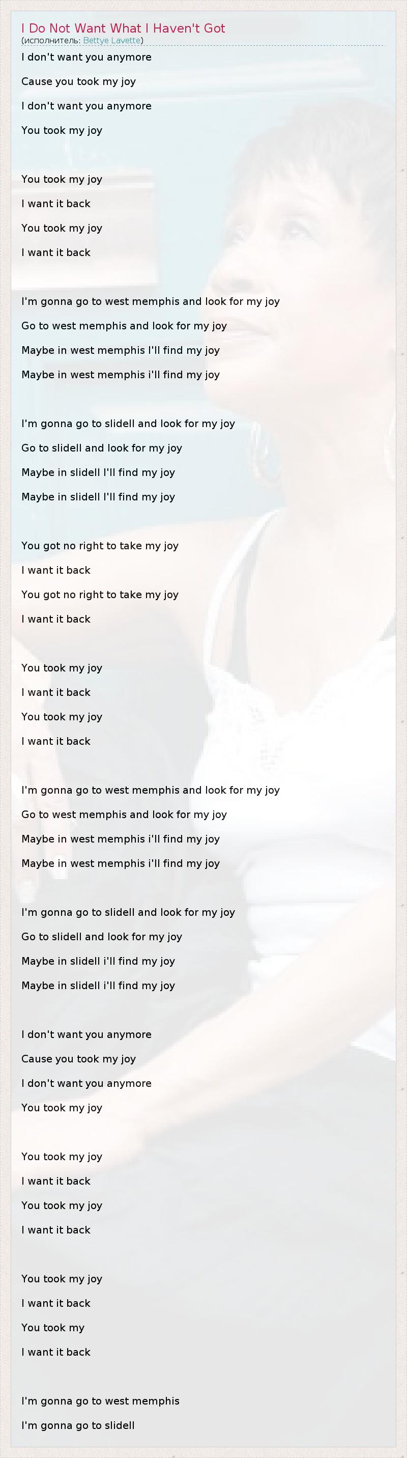 I don't want you anymore Cause you took my joy I don't want you anymore You took my joy You took my joy I want it back You took my joy I want it back I'm gonna go to west memphis and look for my joy Go to west memphis and look for my joy Maybe in west memphis I'll find my joy Maybe in west memphis i'll find my joy I'm gonna go to slidell and look for my joy Go to slidell and look for my joy Maybe in slidell I'll find my joy Maybe in slidell I'll find my joy You got no right to take my joy I want it back You got no right to take my joy I want it back You took my joy I want it back You took my joy I want it back I'm gonna go to west memphis and look for my joy Go to west memphis and look for my joy Maybe in west memphis i'll find my joy Maybe in west memphis i'll find my joy I'm gonna go to slidell and look for my joy Go to slidell and look for my joy Maybe in slidell i'll find my joy Maybe in slidell i'll find my joy I don't want you anymore Cause you took my joy I don't want you anymore You took my joy You took my joy I want it back You took my joy I want it back You took my joy I want it back You took my I want it back I'm gonna go to west memphis I'm gonna go to slidell