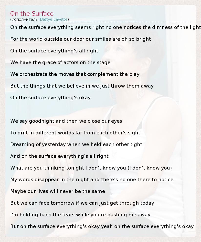 On the surface everything seems right no one notices the dimness of the light For the world outside our door our smiles are oh so bright On the surface everything's all right We have the grace of actors on the stage We orchestrate the moves that complement the play But the things that we believe in we just throw them away On the surface everything's okay We say goodnight and then we close our eyes To drift in different worlds far from each other's sight Dreaming of yesterday when we held each other tight And on the surface everything's all right What are you thinking tonight I don't know you (I don't know you) My words disappear in the night and there's no one there to notice Maybe our lives will never be the same But we can face tomorrow if we can just get through today I'm holding back the tears while you're pushing me away But on the surface everything's okay yeah on the surface everything's okay