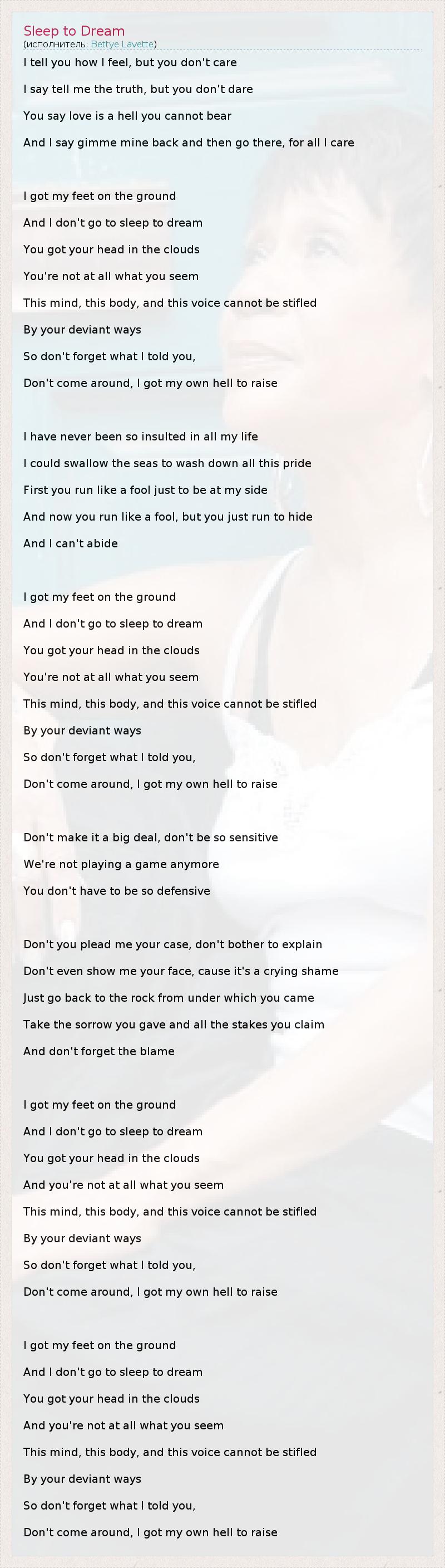 I tell you how I feel, but you don't care I say tell me the truth, but you don't dare You say love is a hell you cannot bear And I say gimme mine back and then go there, for all I care I got my feet on the ground And I don't go to sleep to dream You got your head in the clouds You're not at all what you seem This mind, this body, and this voice cannot be stifled By your deviant ways So don't forget what I told you, Don't come around, I got my own hell to raise I have never been so insulted in all my life I could swallow the seas to wash down all this pride First you run like a fool just to be at my side And now you run like a fool, but you just run to hide And I can't abide I got my feet on the ground And I don't go to sleep to dream You got your head in the clouds You're not at all what you seem This mind, this body, and this voice cannot be stifled By your deviant ways So don't forget what I told you, Don't come around, I got my own hell to raise Don't make it a big deal, don't be so sensitive We're not playing a game anymore You don't have to be so defensive Don't you plead me your case, don't bother to explain Don't even show me your face, cause it's a crying shame Just go back to the rock from under which you came Take the sorrow you gave and all the stakes you claim And don't forget the blame I got my feet on the ground And I don't go to sleep to dream You got your head in the clouds And you're not at all what you seem This mind, this body, and this voice cannot be stifled By your deviant ways So don't forget what I told you, Don't come around, I got my own hell to raise I got my feet on the ground And I don't go to sleep to dream You got your head in the clouds And you're not at all what you seem This mind, this body, and this voice cannot be stifled By your deviant ways So don't forget what I told you, Don't come around, I got my own hell to raise