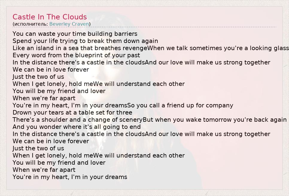 You can waste your time building barriers Spend your life trying to break them down again Like an island in a sea that breathes revengeWhen we talk sometimes you're a looking glass Every word from the blueprint of your past In the distance there's a castle in the cloudsAnd our love will make us strong together We can be in love forever Just the two of us When I get lonely, hold meWe will understand each other You will be my friend and lover When we're far apart You're in my heart, I'm in your dreamsSo you call a friend up for company Drown your tears at a table set for three There's a shoulder and a change of sceneryBut when you wake tomorrow you're back again And you wonder where it's all going to end In the distance there's a castle in the cloudsAnd our love will make us strong together We can be in love forever Just the two of us When I get lonely, hold meWe will understand each other You will be my friend and lover When we're far apart You're in my heart, I'm in your dreams