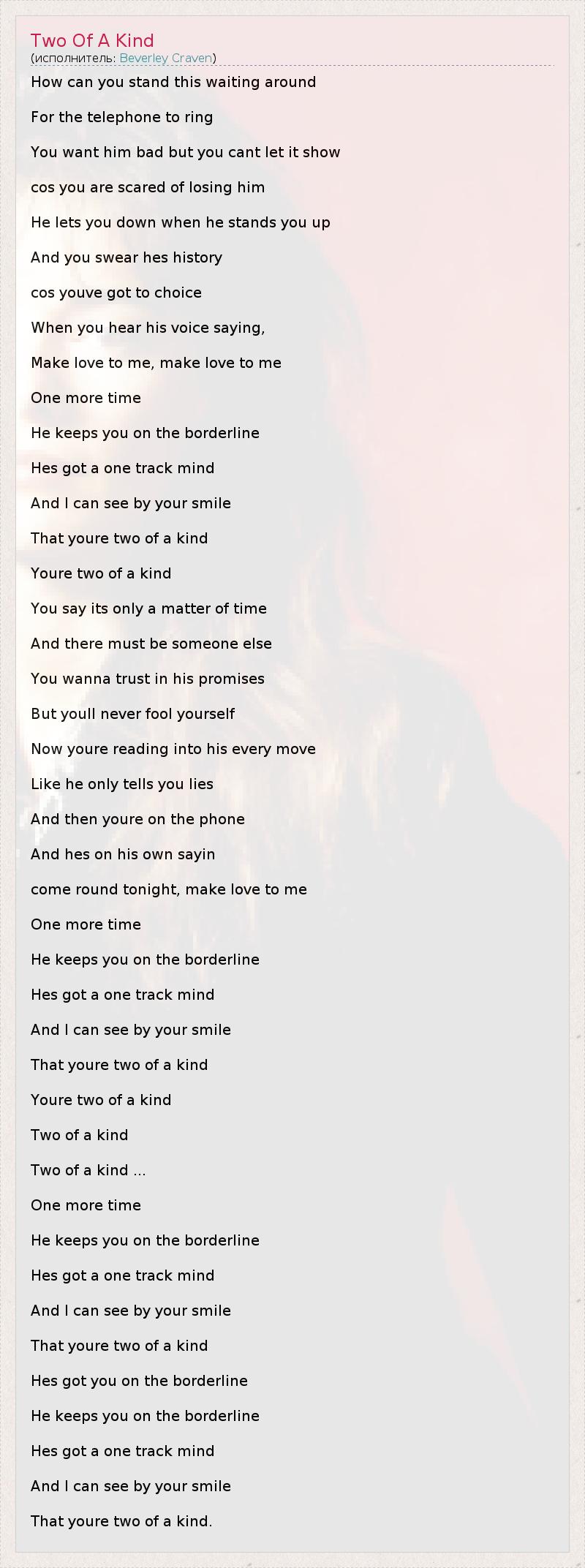 How can you stand this waiting around For the telephone to ring You want him bad but you cant let it show cos you are scared of losing him He lets you down when he stands you up And you swear hes history cos youve got to choice When you hear his voice saying, Make love to me, make love to me One more time He keeps you on the borderline Hes got a one track mind And I can see by your smile That youre two of a kind Youre two of a kind You say its only a matter of time And there must be someone else You wanna trust in his promises But youll never fool yourself Now youre reading into his every move Like he only tells you lies And then youre on the phone And hes on his own sayin come round tonight, make love to me One more time He keeps you on the borderline Hes got a one track mind And I can see by your smile That youre two of a kind Youre two of a kind Two of a kind Two of a kind ... One more time He keeps you on the borderline Hes got a one track mind And I can see by your smile That youre two of a kind Hes got you on the borderline He keeps you on the borderline Hes got a one track mind And I can see by your smile That youre two of a kind.