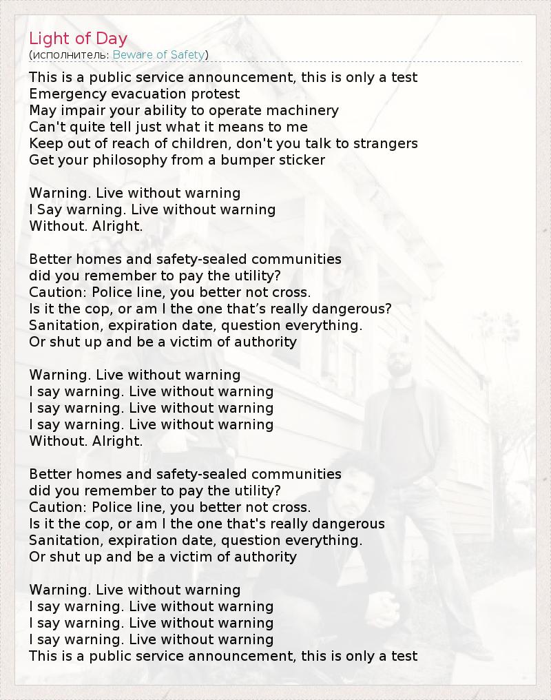 Это объявление службы общественной информации, это просто проверка, Протест против аварийной эвакуации. Я могу навредить вашей способности управлять механизмами, Только сам не знаю, что это значит. Держитесь подальше от детей, не разговаривайте с незнакомцами, А всю философию черпайте с бамперных наклеек. Внимание! Живите, ничего не остерегаясь! Я говорю: "Внимание! Живите, ничего не остерегаясь!" Не [остерегаясь]. Хорошо. Лучшие дома и запечатанные в целях безопасности общины. А вы не забыли заплатить за коммунальные услуги? Предостережение: Полицейская линия, её лучше не пересекать. Это менты или я действительно опасен? Очистка, срок годности - задай вопросы обо всём, Или заткнись и будь жертвой власти. Внимание! Живите, ничего не остерегаясь! Я говорю: "Внимание! Живите, ничего не остерегаясь!" Я говорю: "Внимание! Живите, ничего не остерегаясь!" Я говорю: "Внимание! Живите, ничего не остерегаясь!" Не [остерегаясь]. Хорошо. Лучшие дома и запечатанные в целях безопасности общины, А вы не забыли заплатить за коммунальные услуги? Предостережение: Полицейское ограждение - его лучше не пересекать. Кто из нас действительно опасен: менты или я? Очистка, срок годности - расспрашивай обо всём, Или заткнись и будь жертвой власти. Внимание! Живите, ничего не остерегаясь! Я говорю: "Внимание! Живите, ничего не остерегаясь!" Я говорю: "Внимание! Живите, ничего не остерегаясь!" Я говорю: "Внимание! Живите, ничего не остерегаясь!" Это объявление службы общественной информации, это просто проверка...