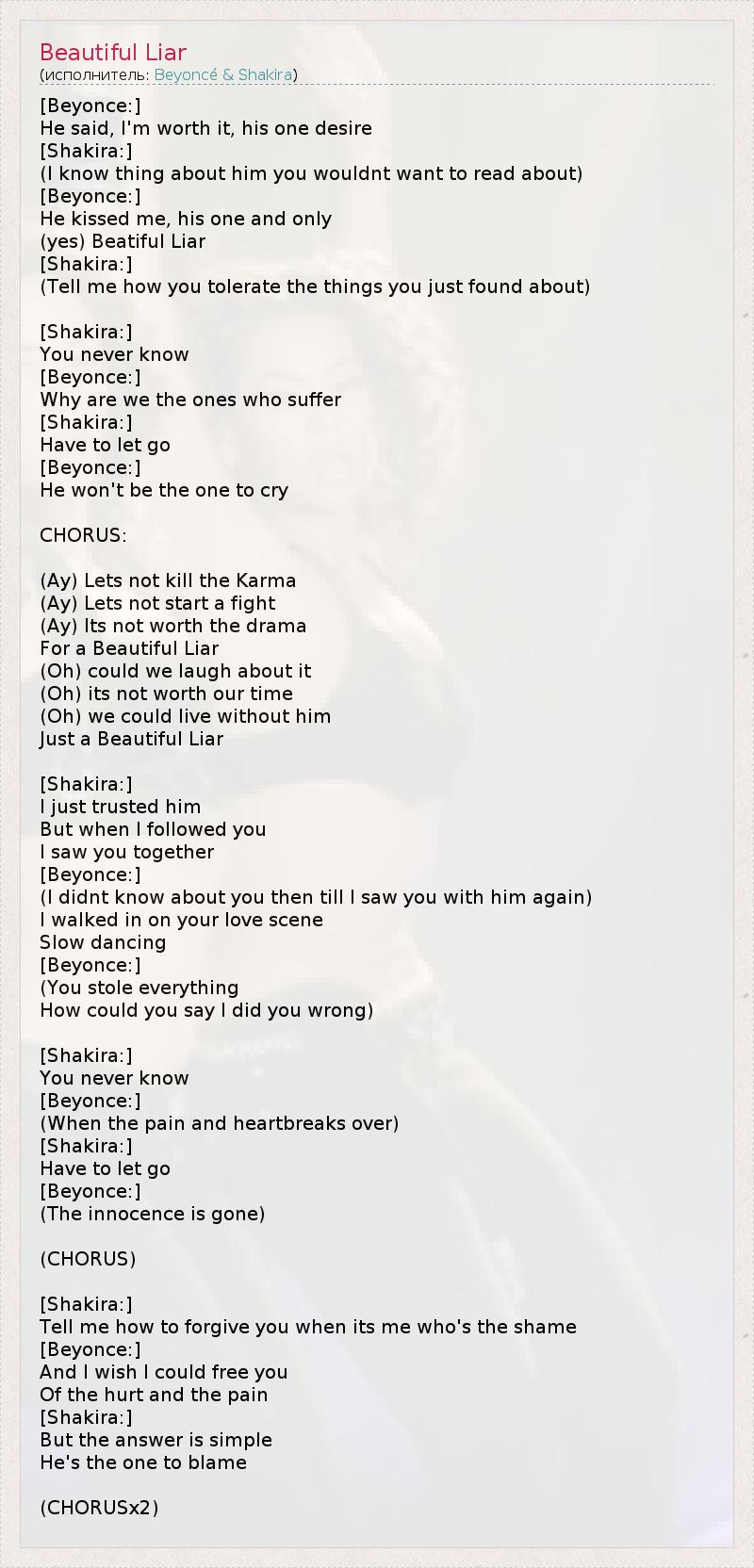 [Beyonce:] He said, I'm worth it, his one desire [Shakira:] (I know thing about him you wouldnt want to read about) [Beyonce:] He kissed me, his one and only (yes) Beatiful Liar [Shakira:] (Tell me how you tolerate the things you just found about) [Shakira:] You never know [Beyonce:] Why are we the ones who suffer [Shakira:] Have to let go [Beyonce:] He won't be the one to cry CHORUS: (Ay) Lets not kill the Karma (Ay) Lets not start a fight (Ay) Its not worth the drama For a Beautiful Liar (Oh) could we laugh about it (Oh) its not worth our time (Oh) we could live without him Just a Beautiful Liar [Shakira:] I just trusted him But when I followed you I saw you together [Beyonce:] (I didnt know about you then till I saw you with him again) I walked in on your love scene Slow dancing [Beyonce:] (You stole everything How could you say I did you wrong) [Shakira:] You never know [Beyonce:] (When the pain and heartbreaks over) [Shakira:] Have to let go [Beyonce:] (The innocence is gone) (CHORUS) [Shakira:] Tell me how to forgive you when its me who's the shame [Beyonce:] And I wish I could free you Of the hurt and the pain [Shakira:] But the answer is simple He's the one to blame (CHORUSx2)