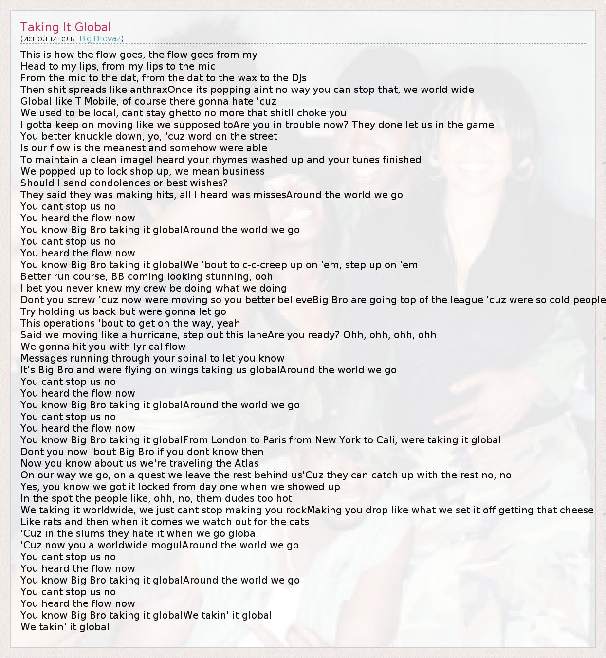 А как ты думаешь, о чем песня "Taking It Global" ?