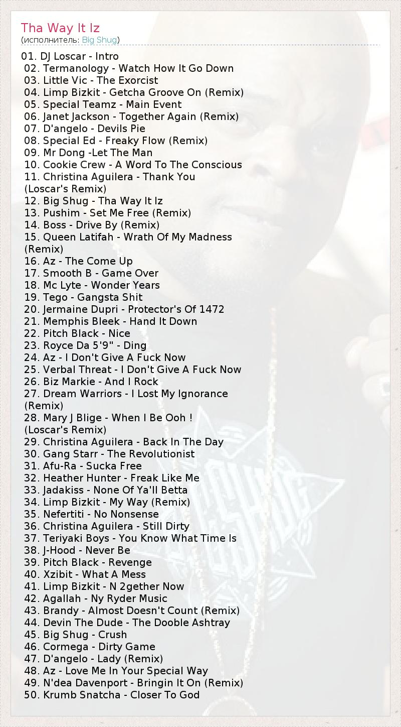01. DJ Loscar - Intro 02. Termanology - Watch How It Go Down 03. Little Vic - The Exorcist 04. Limp Bizkit - Getcha Groove On (Remix) 05. Special Teamz - Main Event 06. Janet Jackson - Together Again (Remix) 07. D'angelo - Devils Pie 08. Special Ed - Freaky Flow (Remix) 09. Mr Dong -Let The Man 10. Cookie Crew - A Word To The Conscious 11. Christina Aguilera - Thank You (Loscar's Remix) 12. Big Shug - Tha Way It Iz 13. Pushim - Set Me Free (Remix) 14. Boss - Drive By (Remix) 15. Queen Latifah - Wrath Of My Madness (Remix) 16. Az - The Come Up 17. Smooth B - Game Over 18. Mc Lyte - Wonder Years 19. Tego - Gangsta Shit 20. Jermaine Dupri - Protector's Of 1472 21. Memphis Bleek - Hand It Down 22. Pitch Black - Nice 23. Royce Da 5'9" - Ding 24. Az - I Don't Give A Fuck Now 25. Verbal Threat - I Don't Give A Fuck Now 26. Biz Markie - And I Rock 27. Dream Warriors - I Lost My Ignorance (Remix) 28. Mary J Blige - When I Be Ooh ! (Loscar's Remix) 29. Christina Aguilera - Back In The Day 30. Gang Starr - The Revolutionist 31. Afu-Ra - Sucka Free 32. Heather Hunter - Freak Like Me 33. Jadakiss - None Of Ya'll Betta 34. Limp Bizkit - My Way (Remix) 35. Nefertiti - No Nonsense 36. Christina Aguilera - Still Dirty 37. Teriyaki Boys - You Know What Time Is 38. J-Hood - Never Be 39. Pitch Black - Revenge 40. Xzibit - What A Mess 41. Limp Bizkit - N 2gether Now 42. Agallah - Ny Ryder Music 43. Brandy - Almost Doesn't Count (Remix) 44. Devin The Dude - The Dooble Ashtray 45. Big Shug - Crush 46. Cormega - Dirty Game 47. D'angelo - Lady (Remix) 48. Az - Love Me In Your Special Way 49. N'dea Davenport - Bringin It On (Remix) 50. Krumb Snatcha - Closer To God