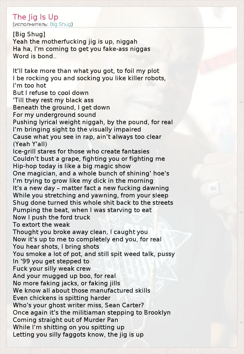 [Big Shug] Yeah the motherfucking jig is up, niggah Ha ha, I'm coming to get you fake-ass niggas Word is bond.. It'll take more than what you got, to foil my plot I be rocking you and socking you like killer robots, I'm too hot But I refuse to cool down 'Till they rest my black ass Beneath the ground, I get down For my underground sound Pushing lyrical weight niggah, by the pound, for real I'm bringing sight to the visually impaired Cause what you see in rap, ain't always too clear (Yeah Y'all) Ice-grill stares for those who create fantasies Couldn't bust a grape, fighting you or fighting me Hip-hop today is like a big magic show One magician, and a whole bunch of shining' hoe's I'm trying to grow like my dick in the morning It's a new day – matter fact a new fucking dawning While you stretching and yawning, from your sleep Shug done turned this whole shit back to the streets Pumping the beat, when I was starving to eat Now I push the ford truck To extort the weak Thought you broke away clean, I caught you Now it's up to me to completely end you, for real You hear shots, I bring shots You smoke a lot of pot, and still spit weed talk, pussy In '99 you get stepped to Fuck your silly weak crew And your mugged up boo, for real No more faking jacks, or faking jills We know all about those manufactured skills Even chickens is spitting harder Who's your ghost writer miss, Sean Carter? Once again it's the militiaman stepping to Brooklyn Coming straight out of Murder Pan While I'm shitting on you spitting up Letting you silly faggots know, the jig is up