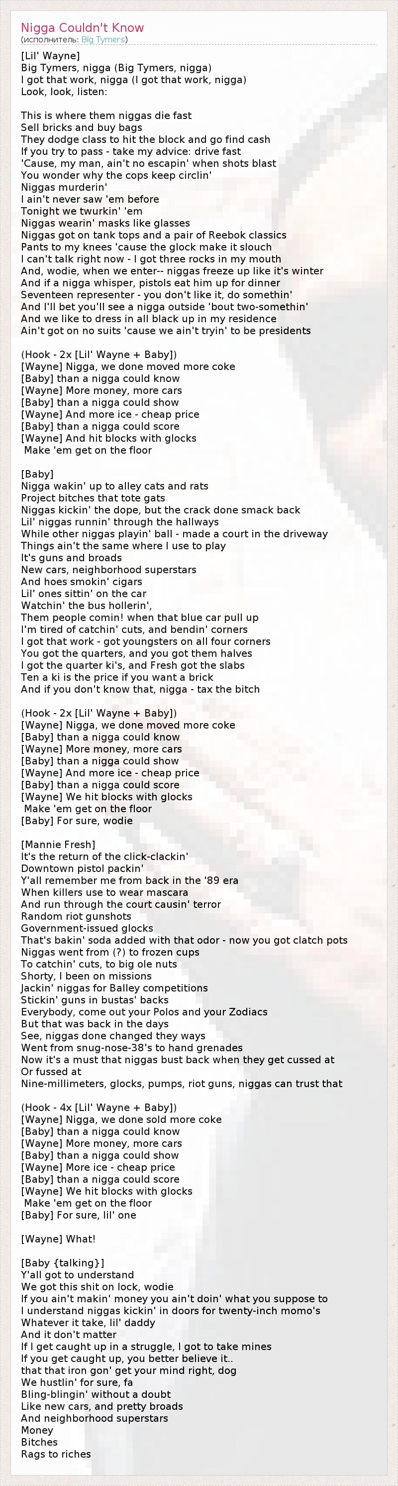 А как ты думаешь, о чем песня "Nigga Couldn't Know" ?