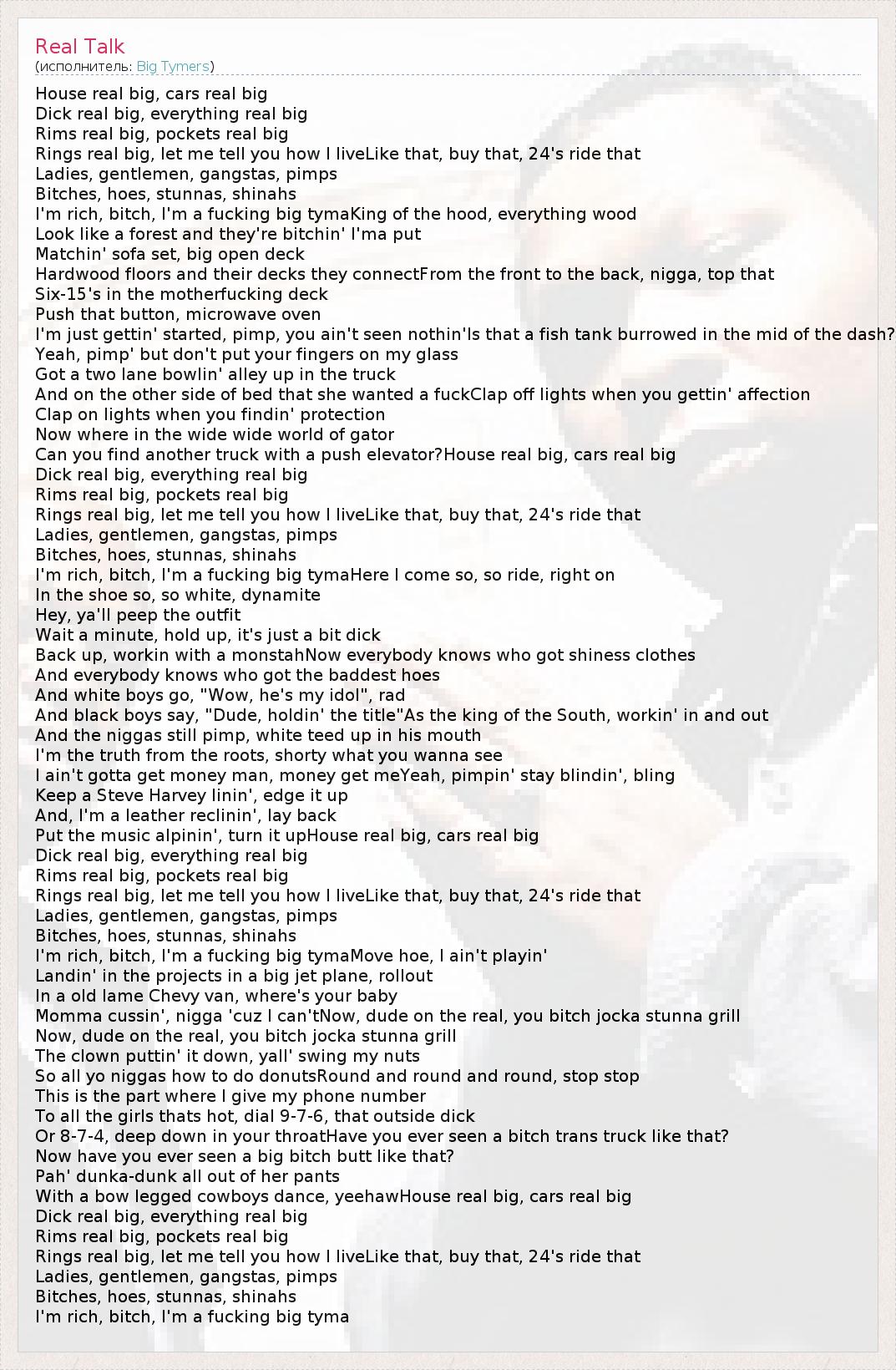 House real big, cars real big Dick real big, everything real big Rims real big, pockets real big Rings real big, let me tell you how I liveLike that, buy that, 24's ride that Ladies, gentlemen, gangstas, pimps Bitches, hoes, stunnas, shinahs I'm rich, bitch, I'm a fucking big tymaKing of the hood, everything wood Look like a forest and they're bitchin' I'ma put Matchin' sofa set, big open deck Hardwood floors and their decks they connectFrom the front to the back, nigga, top that Six-15's in the motherfucking deck Push that button, microwave oven I'm just gettin' started, pimp, you ain't seen nothin'Is that a fish tank burrowed in the mid of the dash? Yeah, pimp' but don't put your fingers on my glass Got a two lane bowlin' alley up in the truck And on the other side of bed that she wanted a fuckClap off lights when you gettin' affection Clap on lights when you findin' protection Now where in the wide wide world of gator Can you find another truck with a push elevator?House real big, cars real big Dick real big, everything real big Rims real big, pockets real big Rings real big, let me tell you how I liveLike that, buy that, 24's ride that Ladies, gentlemen, gangstas, pimps Bitches, hoes, stunnas, shinahs I'm rich, bitch, I'm a fucking big tymaHere I come so, so ride, right on In the shoe so, so white, dynamite Hey, ya'll peep the outfit Wait a minute, hold up, it's just a bit dick Back up, workin with a monstahNow everybody knows who got shiness clothes And everybody knows who got the baddest hoes And white boys go, "Wow, he's my idol", rad And black boys say, "Dude, holdin' the title"As the king of the South, workin' in and out And the niggas still pimp, white teed up in his mouth I'm the truth from the roots, shorty what you wanna see I ain't gotta get money man, money get meYeah, pimpin' stay blindin', bling Keep a Steve Harvey linin', edge it up And, I'm a leather reclinin', lay back Put the music alpinin', turn it upHouse real big, cars real big Dick real big, everything real big Rims real big, pockets real big Rings real big, let me tell you how I liveLike that, buy that, 24's ride that Ladies, gentlemen, gangstas, pimps Bitches, hoes, stunnas, shinahs I'm rich, bitch, I'm a fucking big tymaMove hoe, I ain't playin' Landin' in the projects in a big jet plane, rollout In a old lame Chevy van, where's your baby Momma cussin', nigga 'cuz I can'tNow, dude on the real, you bitch jocka stunna grill Now, dude on the real, you bitch jocka stunna grill The clown puttin' it down, yall' swing my nuts So all yo niggas how to do donutsRound and round and round, stop stop This is the part where I give my phone number To all the girls thats hot, dial 9-7-6, that outside dick Or 8-7-4, deep down in your throatHave you ever seen a bitch trans truck like that? Now have you ever seen a big bitch butt like that? Pah' dunka-dunk all out of her pants With a bow legged cowboys dance, yeehawHouse real big, cars real big Dick real big, everything real big Rims real big, pockets real big Rings real big, let me tell you how I liveLike that, buy that, 24's ride that Ladies, gentlemen, gangstas, pimps Bitches, hoes, stunnas, shinahs I'm rich, bitch, I'm a fucking big tyma