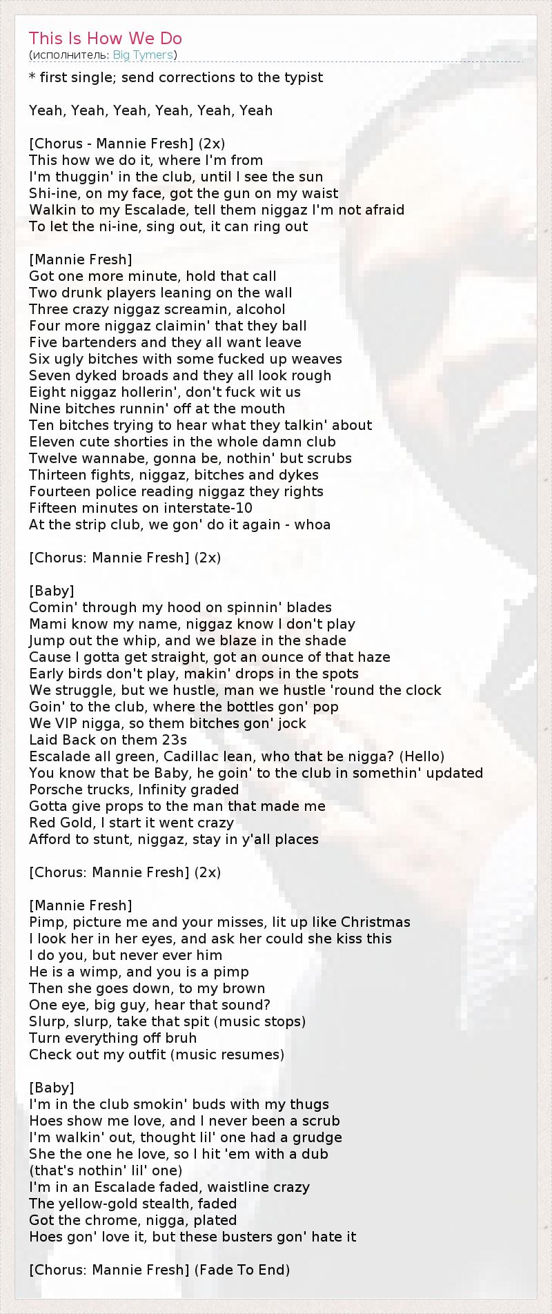 * first single; send corrections to the typist Yeah, Yeah, Yeah, Yeah, Yeah, Yeah [Chorus - Mannie Fresh] (2x) This how we do it, where I'm from I'm thuggin' in the club, until I see the sun Shi-ine, on my face, got the gun on my waist Walkin to my Escalade, tell them niggaz I'm not afraid To let the ni-ine, sing out, it can ring out [Mannie Fresh] Got one more minute, hold that call Two drunk players leaning on the wall Three crazy niggaz screamin, alcohol Four more niggaz claimin' that they ball Five bartenders and they all want leave Six ugly bitches with some fucked up weaves Seven dyked broads and they all look rough Eight niggaz hollerin', don't fuck wit us Nine bitches runnin' off at the mouth Ten bitches trying to hear what they talkin' about Eleven cute shorties in the whole damn club Twelve wannabe, gonna be, nothin' but scrubs Thirteen fights, niggaz, bitches and dykes Fourteen police reading niggaz they rights Fifteen minutes on interstate-10 At the strip club, we gon' do it again - whoa [Chorus: Mannie Fresh] (2x) [Baby] Comin' through my hood on spinnin' blades Mami know my name, niggaz know I don't play Jump out the whip, and we blaze in the shade Cause I gotta get straight, got an ounce of that haze Early birds don't play, makin' drops in the spots We struggle, but we hustle, man we hustle 'round the clock Goin' to the club, where the bottles gon' pop We VIP nigga, so them bitches gon' jock Laid Back on them 23s Escalade all green, Cadillac lean, who that be nigga? (Hello) You know that be Baby, he goin' to the club in somethin' updated Porsche trucks, Infinity graded Gotta give props to the man that made me Red Gold, I start it went crazy Afford to stunt, niggaz, stay in y'all places [Chorus: Mannie Fresh] (2x) [Mannie Fresh] Pimp, picture me and your misses, lit up like Christmas I look her in her eyes, and ask her could she kiss this I do you, but never ever him He is a wimp, and you is a pimp Then she goes down, to my brown One eye, big guy, hear that sound? Slurp, slurp, take that spit (music stops) Turn everything off bruh Check out my outfit (music resumes) [Baby] I'm in the club smokin' buds with my thugs Hoes show me love, and I never been a scrub I'm walkin' out, thought lil' one had a grudge She the one he love, so I hit 'em with a dub (that's nothin' lil' one) I'm in an Escalade faded, waistline crazy The yellow-gold stealth, faded Got the chrome, nigga, plated Hoes gon' love it, but these busters gon' hate it [Chorus: Mannie Fresh] (Fade To End)