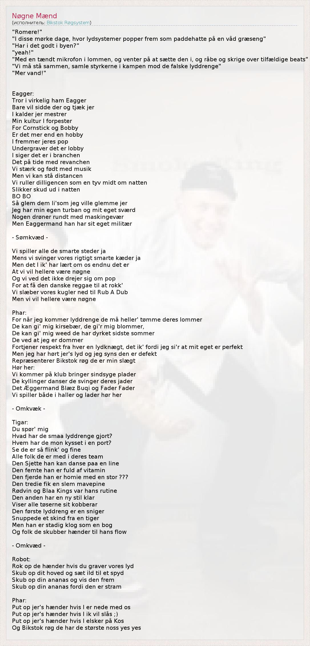 "Romere!" "I disse mørke dage, hvor lydsystemer popper frem som paddehatte på en våd græseng" "Har i det godt i byen?" "yeah!" "Med en tændt mikrofon i lommen, og venter på at sætte den i, og råbe og skrige over tilfældige beats" "Vi må stå sammen, samle styrkerne i kampen mod de falske lyddrenge" "Mer vand!" Eagger: Tror i virkelig ham Eagger Bare vil sidde der og tjæk jer I kalder jer mestrer Min kultur I forpester For Cornstick og Bobby Er det mer end en hobby I fremmer jeres pop Undergraver det er lobby I siger det er i branchen Det på tide med revanchen Vi stærk og født med musik Men vi kan stå distancen Vi ruller dilligencen som en tyv midt om natten Slikker skud ud i natten BO BO Så glem dem li'som jeg ville glemme jer Jeg har min egen turban og mit eget sværd Nogen drøner rundt med maskingevær Men Eaggermand han har sit eget militær - Sømkvæd - Vi spiller alle de smarte steder ja Mens vi svinger vores rigtigt smarte kæder ja Men det I ik' har lært om os endnu det er At vi vil hellere være nøgne Og vi ved det ikke drejer sig om pop For at få den danske reggae til at rokk' Vi slæber vores kugler ned til Rub A Dub Men vi vil hellere være nøgne Phar: For når jeg kommer lyddrenge de må heller' tømme deres lommer De kan gi' mig kirsebær, de gi'r mig blommer, De kan gi' mig weed de har dyrket sidste sommer De ved at jeg er dommer Fortjener respekt fra hver en lydknægt, det ik' fordi jeg si'r at mit eget er perfekt Men jeg har hørt jer's lyd og jeg syns den er defekt Repræsenterer Bikstok røg de er min slægt Hør her: Vi kommer på klub bringer sindsyge plader De kyllinger danser de svinger deres jader Det Æggermand Blæz Buqi og Fader Fader Vi spiller både i haller og lader hør her - Omkvæk - Tigar: Du spør' mig Hvad har de smaa lyddrenge gjort? Hvem har de mon kysset i en port? Se de er så flink' og fine Alle folk de er med i deres team Den Sjette han kan danse paa en line Den femte han er fuld af vitamin Den fjerde han er homie med en stor ??? Den tredie fik en slem mavepine Rødvin og Blaa Kings var hans rutine Den anden har en ny stil klar Viser alle tøserne sit kobberar Den første lyddreng er en sniger Snuppede et skind fra en tiger Men han er stadig klog som en bog Og folk de skubber hænder til hans flow - Omkvæd - Robot: Rok op de hænder hvis du graver vores lyd Skub op dit hoved og sæt ild til et spyd Skub op din ananas og vis den frem Skub op din ananas fordi den er stram Phar: Put op jer's hænder hvis I er nede med os Put op jer's hænder hvis I ik vil slås ;) Put op jer's hænder hvis I elsker på Kos Og Bikstok røg de har de største noss yes yes