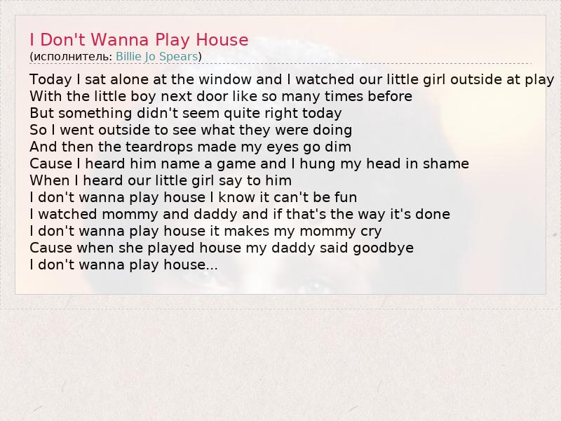 Today I sat alone at the window and I watched our little girl outside at play With the little boy next door like so many times before But something didn't seem quite right today So I went outside to see what they were doing And then the teardrops made my eyes go dim Cause I heard him name a game and I hung my head in shame When I heard our little girl say to him I don't wanna play house I know it can't be fun I watched mommy and daddy and if that's the way it's done I don't wanna play house it makes my mommy cry Cause when she played house my daddy said goodbye I don't wanna play house...