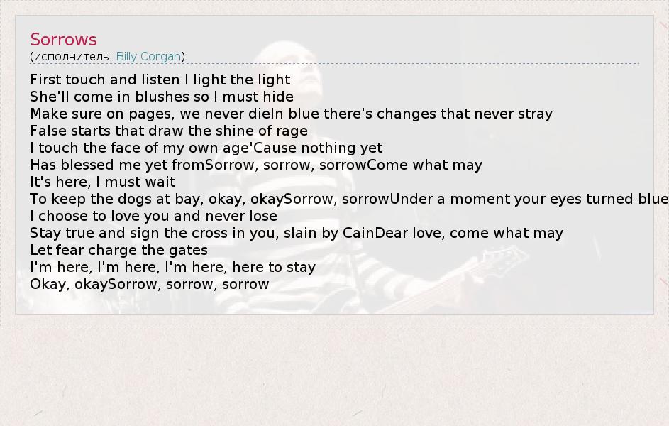 First touch and listen I light the light She'll come in blushes so I must hide Make sure on pages, we never dieIn blue there's changes that never stray False starts that draw the shine of rage I touch the face of my own age'Cause nothing yet Has blessed me yet fromSorrow, sorrow, sorrowCome what may It's here, I must wait To keep the dogs at bay, okay, okaySorrow, sorrowUnder a moment your eyes turned blue I choose to love you and never lose Stay true and sign the cross in you, slain by CainDear love, come what may Let fear charge the gates I'm here, I'm here, I'm here, here to stay Okay, okaySorrow, sorrow, sorrow