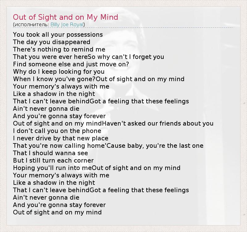 You took all your possessions The day you disappeared There's nothing to remind me That you were ever hereSo why can't I forget you Find someone else and just move on? Why do I keep looking for you When I know you've gone?Out of sight and on my mind Your memory's always with me Like a shadow in the night That I can't leave behindGot a feeling that these feelings Ain't never gonna die And you're gonna stay forever Out of sight and on my mindHaven't asked our friends about you I don't call you on the phone I never drive by that new place That you're now calling home'Cause baby, you're the last one That I should wanna see But I still turn each corner Hoping you'll run into meOut of sight and on my mind Your memory's always with me Like a shadow in the night That I can't leave behindGot a feeling that these feelings Ain't never gonna die And you're gonna stay forever Out of sight and on my mind