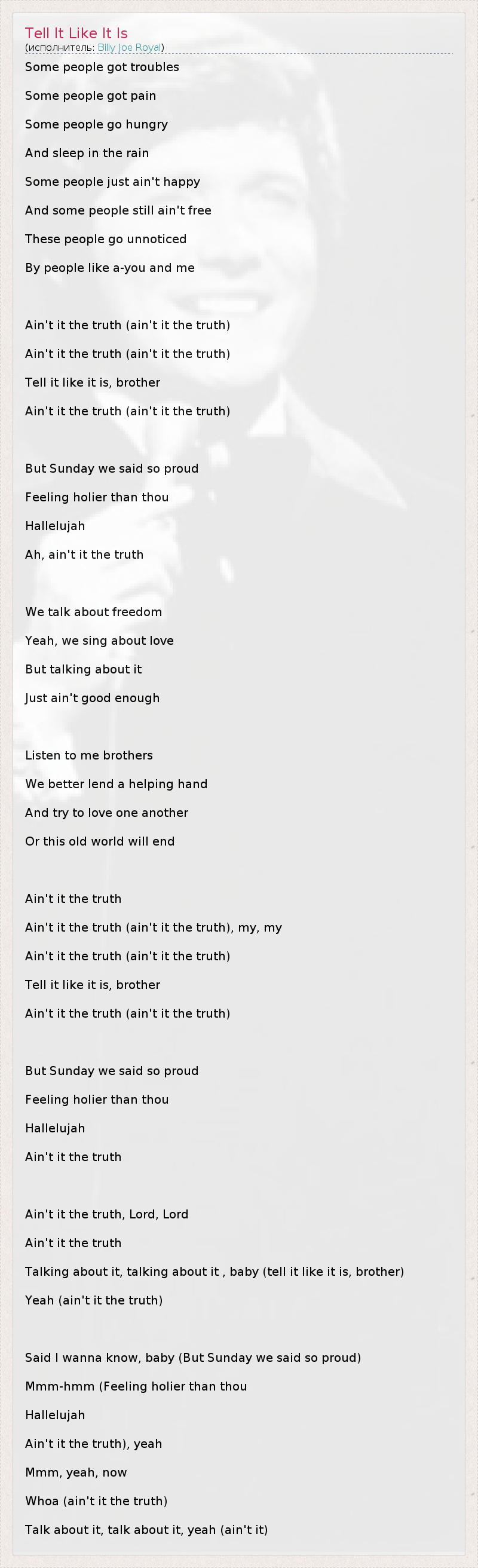 Some people got troubles Some people got pain Some people go hungry And sleep in the rain Some people just ain't happy And some people still ain't free These people go unnoticed By people like a-you and me Ain't it the truth (ain't it the truth) Ain't it the truth (ain't it the truth) Tell it like it is, brother Ain't it the truth (ain't it the truth) But Sunday we said so proud Feeling holier than thou Hallelujah Ah, ain't it the truth We talk about freedom Yeah, we sing about love But talking about it Just ain't good enough Listen to me brothers We better lend a helping hand And try to love one another Or this old world will end Ain't it the truth Ain't it the truth (ain't it the truth), my, my Ain't it the truth (ain't it the truth) Tell it like it is, brother Ain't it the truth (ain't it the truth) But Sunday we said so proud Feeling holier than thou Hallelujah Ain't it the truth Ain't it the truth, Lord, Lord Ain't it the truth Talking about it, talking about it , baby (tell it like it is, brother) Yeah (ain't it the truth) Said I wanna know, baby (But Sunday we said so proud) Mmm-hmm (Feeling holier than thou Hallelujah Ain't it the truth), yeah Mmm, yeah, now Whoa (ain't it the truth) Talk about it, talk about it, yeah (ain't it)
