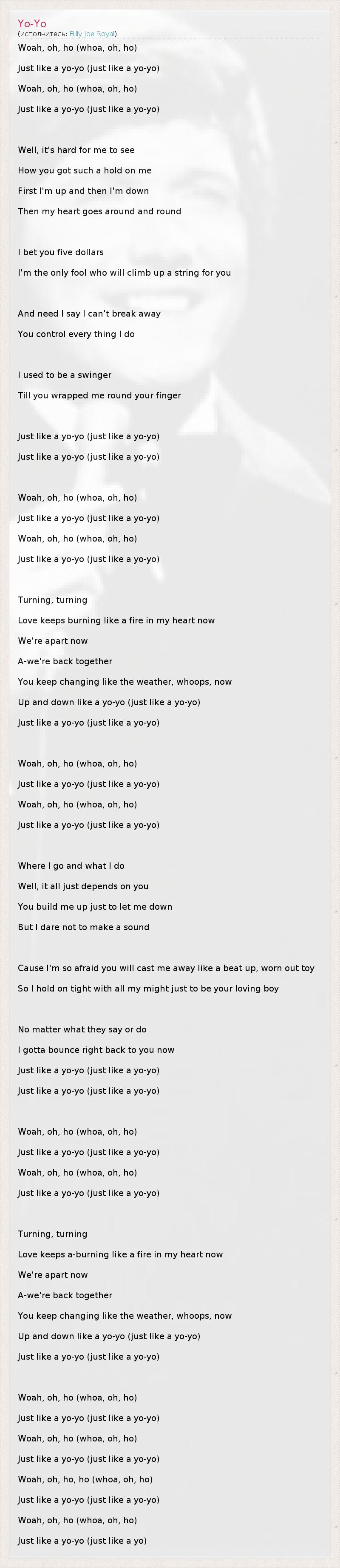 Woah, oh, ho (whoa, oh, ho) Just like a yo-yo (just like a yo-yo) Woah, oh, ho (whoa, oh, ho) Just like a yo-yo (just like a yo-yo) Well, it's hard for me to see How you got such a hold on me First I'm up and then I'm down Then my heart goes around and round I bet you five dollars I'm the only fool who will climb up a string for you And need I say I can't break away You control every thing I do I used to be a swinger Till you wrapped me round your finger Just like a yo-yo (just like a yo-yo) Just like a yo-yo (just like a yo-yo) Woah, oh, ho (whoa, oh, ho) Just like a yo-yo (just like a yo-yo) Woah, oh, ho (whoa, oh, ho) Just like a yo-yo (just like a yo-yo) Turning, turning Love keeps burning like a fire in my heart now We're apart now A-we're back together You keep changing like the weather, whoops, now Up and down like a yo-yo (just like a yo-yo) Just like a yo-yo (just like a yo-yo) Woah, oh, ho (whoa, oh, ho) Just like a yo-yo (just like a yo-yo) Woah, oh, ho (whoa, oh, ho) Just like a yo-yo (just like a yo-yo) Where I go and what I do Well, it all just depends on you You build me up just to let me down But I dare not to make a sound Cause I'm so afraid you will cast me away like a beat up, worn out toy So I hold on tight with all my might just to be your loving boy No matter what they say or do I gotta bounce right back to you now Just like a yo-yo (just like a yo-yo) Just like a yo-yo (just like a yo-yo) Woah, oh, ho (whoa, oh, ho) Just like a yo-yo (just like a yo-yo) Woah, oh, ho (whoa, oh, ho) Just like a yo-yo (just like a yo-yo) Turning, turning Love keeps a-burning like a fire in my heart now We're apart now A-we're back together You keep changing like the weather, whoops, now Up and down like a yo-yo (just like a yo-yo) Just like a yo-yo (just like a yo-yo) Woah, oh, ho (whoa, oh, ho) Just like a yo-yo (just like a yo-yo) Woah, oh, ho (whoa, oh, ho) Just like a yo-yo (just like a yo-yo) Woah, oh, ho, ho (whoa, oh, ho) Just like a yo-yo (just like a yo-yo) Woah, oh, ho (whoa, oh, ho) Just like a yo-yo (just like a yo)