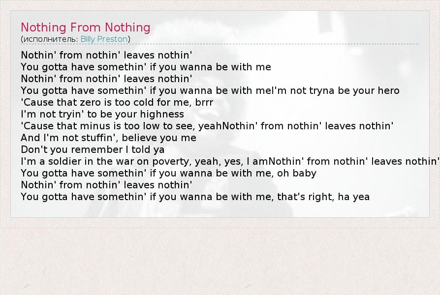 Nothin' from nothin' leaves nothin' You gotta have somethin' if you wanna be with me Nothin' from nothin' leaves nothin' You gotta have somethin' if you wanna be with meI'm not tryna be your hero 'Cause that zero is too cold for me, brrr I'm not tryin' to be your highness 'Cause that minus is too low to see, yeahNothin' from nothin' leaves nothin' And I'm not stuffin', believe you me Don't you remember I told ya I'm a soldier in the war on poverty, yeah, yes, I amNothin' from nothin' leaves nothin' You gotta have somethin' if you wanna be with me, oh baby Nothin' from nothin' leaves nothin' You gotta have somethin' if you wanna be with me, that's right, ha yea