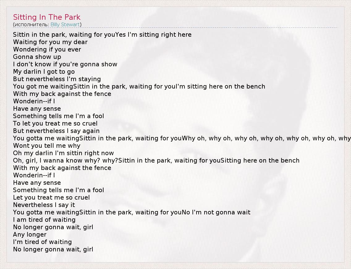 Sittin in the park, waiting for youYes I'm sitting right here Waiting for you my dear Wondering if you ever Gonna show up I don't know if you're gonna show My darlin I got to go But nevertheless I'm staying You got me waitingSittin in the park, waiting for youI'm sitting here on the bench With my back against the fence Wonderin--if I Have any sense Something tells me I'm a fool To let you treat me so cruel But nevertheless I say again You gotta me waitingSittin in the park, waiting for youWhy oh, why oh, why oh, why oh, why oh, why oh, why Wont you tell me why Oh my darlin I'm sittin right now Oh, girl, I wanna know why? why?Sittin in the park, waiting for youSitting here on the bench With my back against the fence Wonderin--if I Have any sense Something tells me I'm a fool Let you treat me so cruel Nevertheless I say it You gotta me waitingSittin in the park, waiting for youNo I'm not gonna wait I am tired of waiting No longer gonna wait, girl Any longer I'm tired of waiting No longer gonna wait, girl