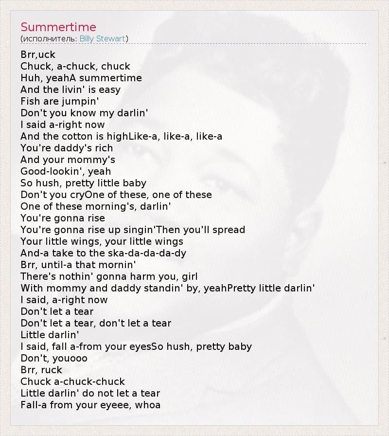 Brr,uck Chuck, a-chuck, chuck Huh, yeahA summertime And the livin' is easy Fish are jumpin' Don't you know my darlin' I said a-right now And the cotton is highLike-a, like-a, like-a You're daddy's rich And your mommy's Good-lookin', yeah So hush, pretty little baby Don't you cryOne of these, one of these One of these morning's, darlin' You're gonna rise You're gonna rise up singin'Then you'll spread Your little wings, your little wings And-a take to the ska-da-da-da-dy Brr, until-a that mornin' There's nothin' gonna harm you, girl With mommy and daddy standin' by, yeahPretty little darlin' I said, a-right now Don't let a tear Don't let a tear, don't let a tear Little darlin' I said, fall a-from your eyesSo hush, pretty baby Don't, youooo Brr, ruck Chuck a-chuck-chuck Little darlin' do not let a tear Fall-a from your eyeee, whoa