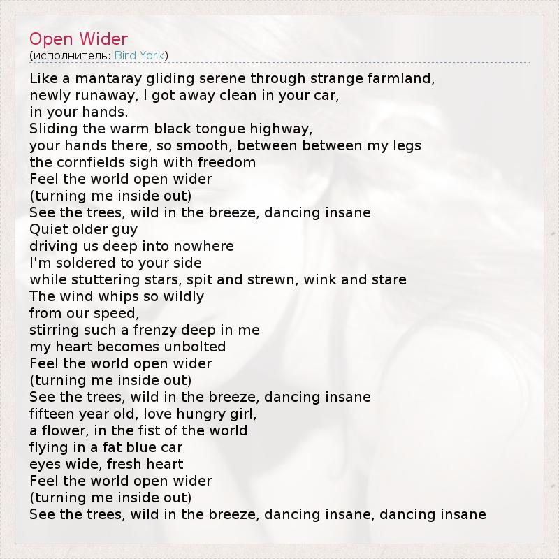 Like a mantaray gliding serene through strange farmland, newly runaway, I got away clean in your car, in your hands. Sliding the warm black tongue highway, your hands there, so smooth, between between my legs the cornfields sigh with freedom Feel the world open wider (turning me inside out) See the trees, wild in the breeze, dancing insane Quiet older guy driving us deep into nowhere I'm soldered to your side while stuttering stars, spit and strewn, wink and stare The wind whips so wildly from our speed, stirring such a frenzy deep in me my heart becomes unbolted Feel the world open wider (turning me inside out) See the trees, wild in the breeze, dancing insane fifteen year old, love hungry girl, a flower, in the fist of the world flying in a fat blue car eyes wide, fresh heart Feel the world open wider (turning me inside out) See the trees, wild in the breeze, dancing insane, dancing insane