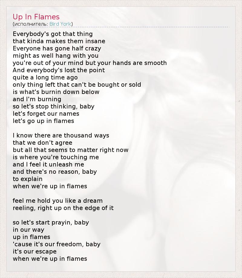 Everybody's got that thing that kinda makes them insane Everyone has gone half crazy might as well hang with you you're out of your mind but your hands are smooth And everybody's lost the point quite a long time ago only thing left that can't be bought or sold is what's burnin down below and I'm burning so let's stop thinking, baby let's forget our names let's go up in flames I know there are thousand ways that we don't agree but all that seems to matter right now is where you're touching me and I feel it unleash me and there's no reason, baby to explain when we're up in flames feel me hold you like a dream reeling, right up on the edge of it so let's start prayin, baby in our way up in flames 'cause it's our freedom, baby it's our escape when we're up in flames