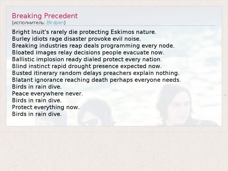 А как ты думаешь, о чем песня "Breaking Precedent" ?